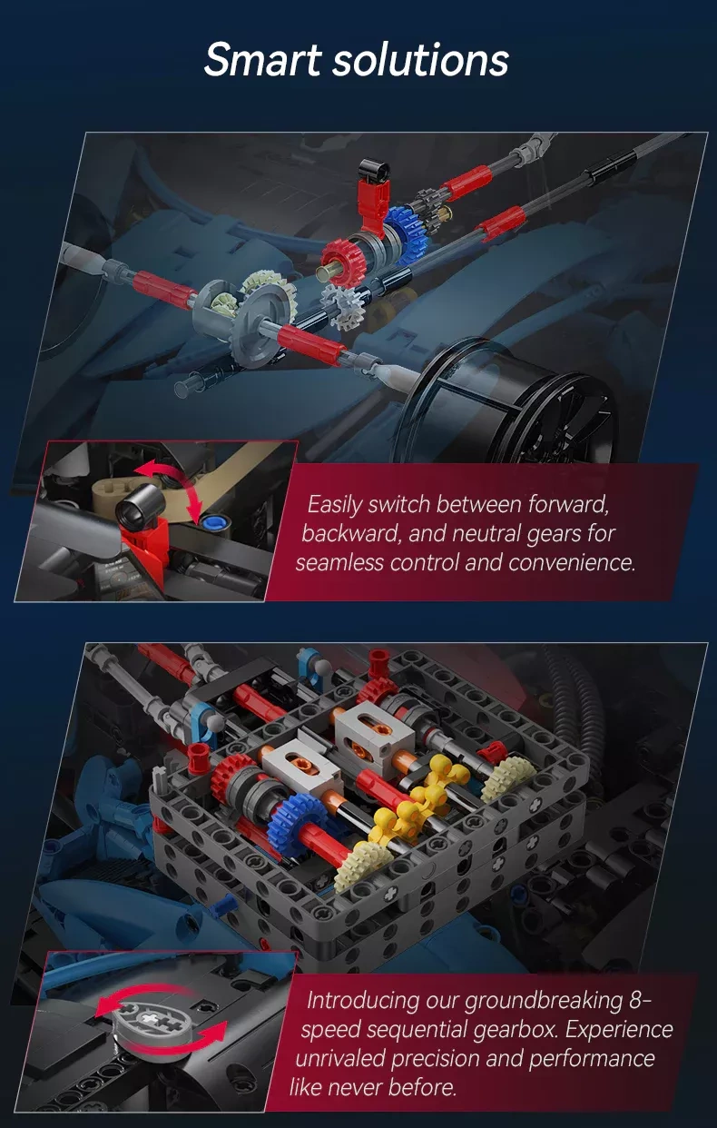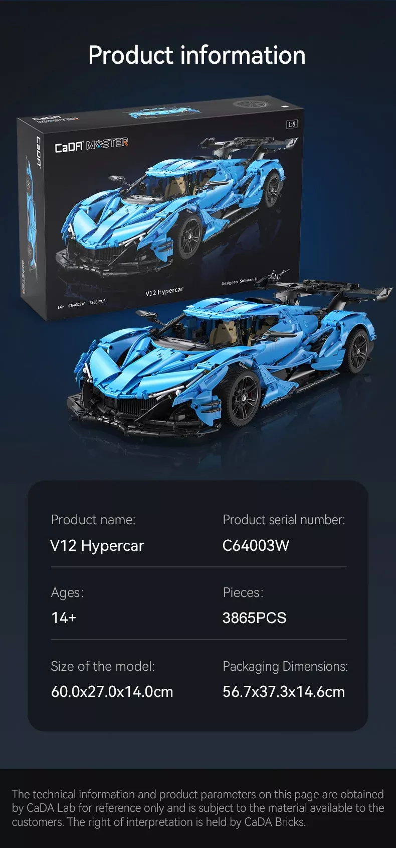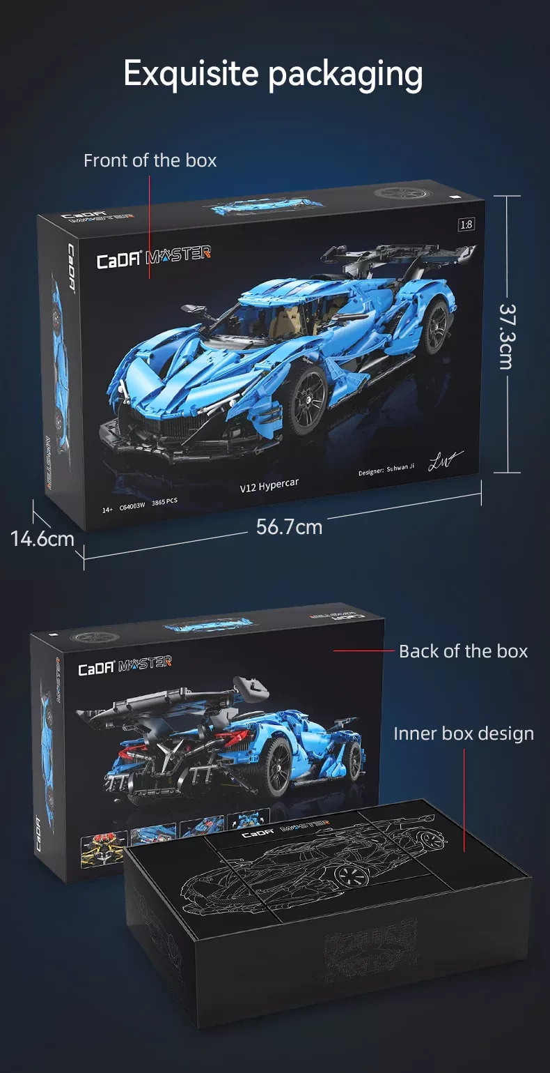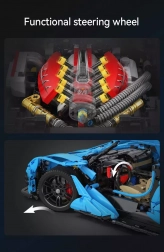 Denne storformat V12 hypercar fra CADA Master-serien vil begejstre alle fans af tekniske byggesæt. Under byggeriet kan du nyde gennemtænkte mekaniske elementer, der understreger den realistiske oplevelse: fra funktionsdygtig styring og åbningsbare døre til autentiske detaljer i cockpittet. Takket være den elegante blå karrosseri bliver den et iøjnefaldende indslag i enhver samling.