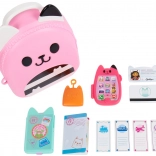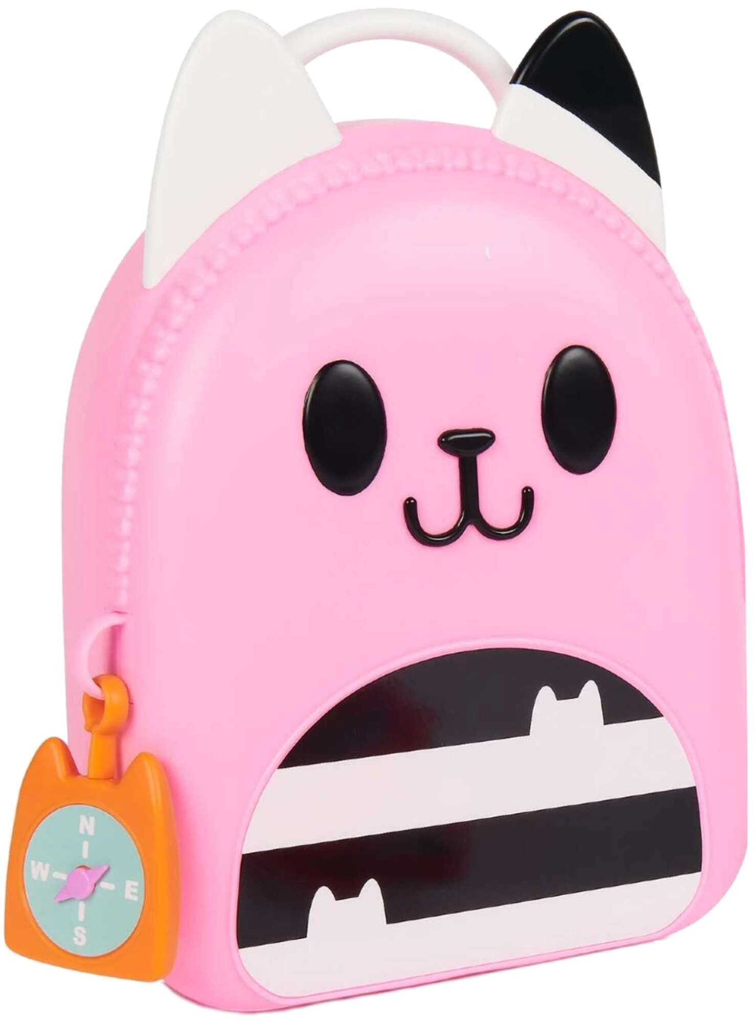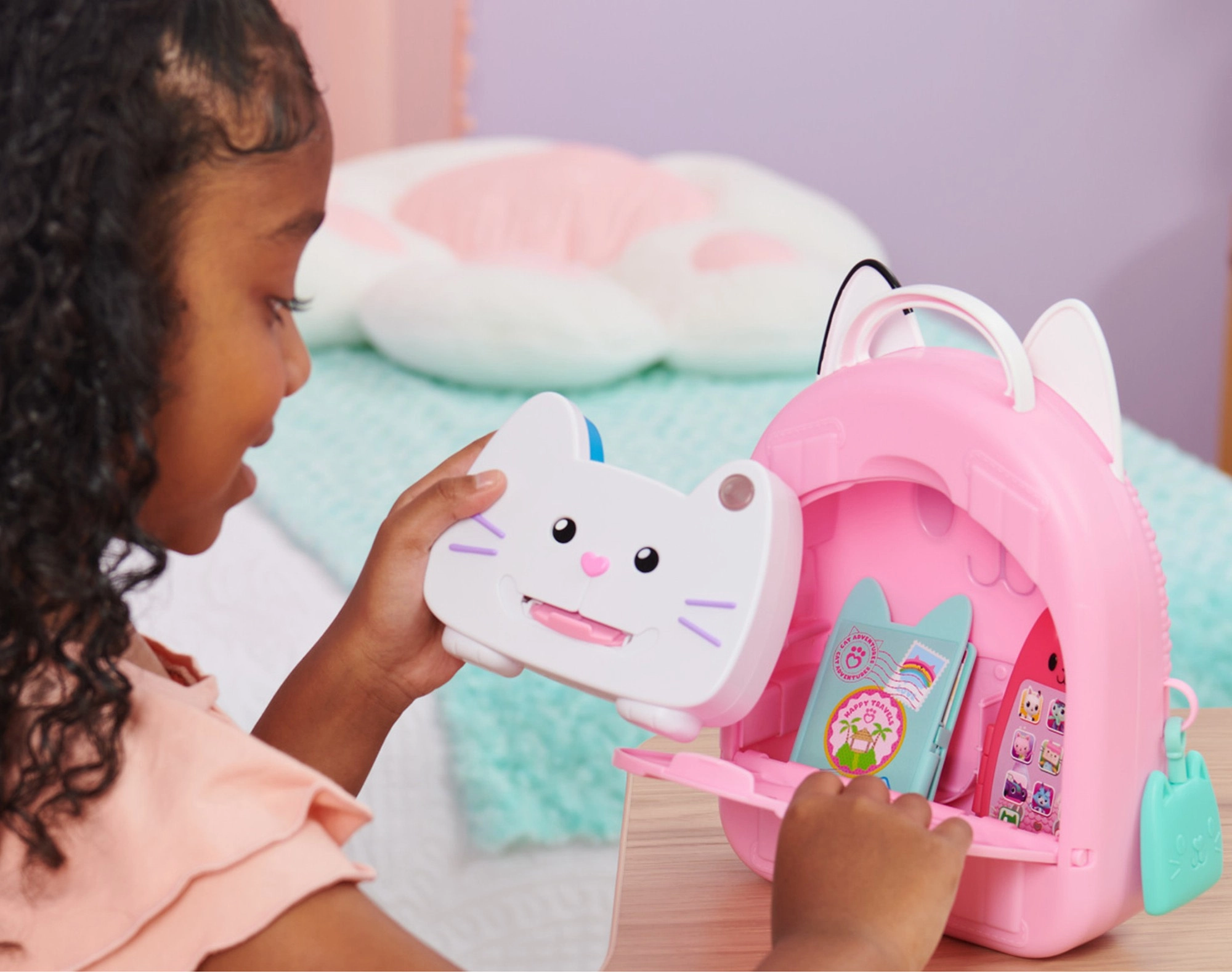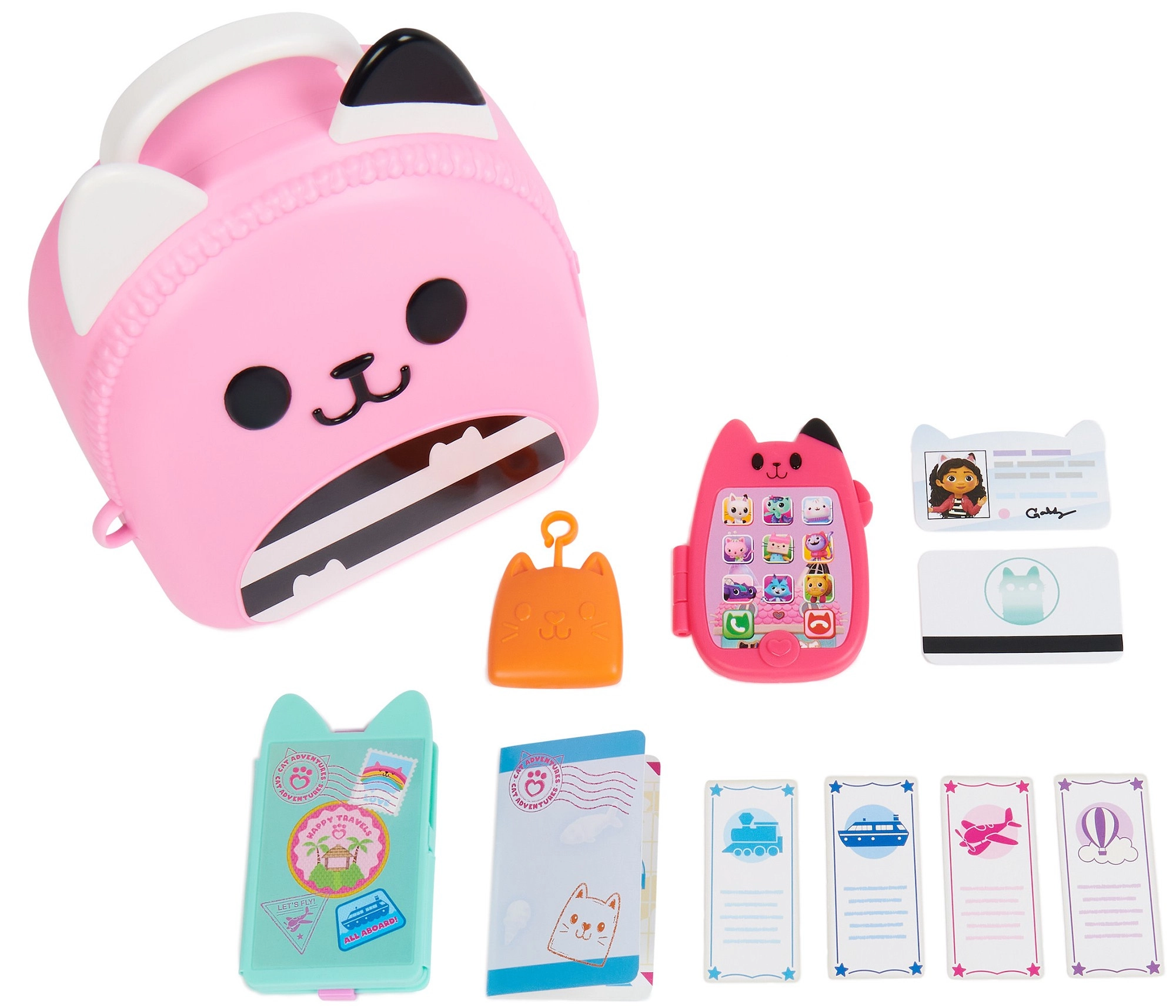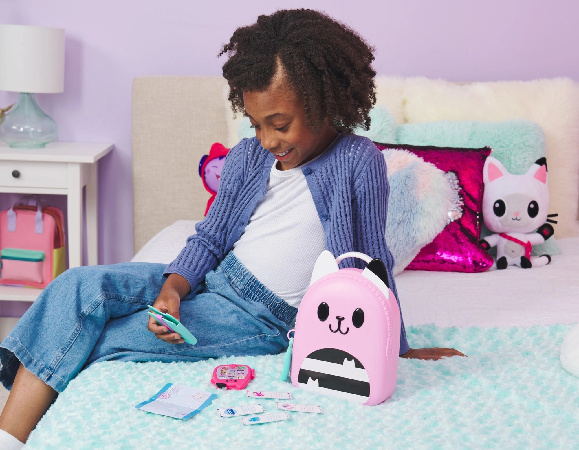 Tag børnene med ind i GABBY’S DOLLHOUSE-universet med dette søde rejsesæt. Det indeholder en lyserød katterygsæk, en åbnbar telefon, en pung og legedokumenter og billetter til rejseleg. Alt er kompakt og bærbart, designet til kreativ leg og nem opbevaring af alle 11 dele direkte i rygsækken.