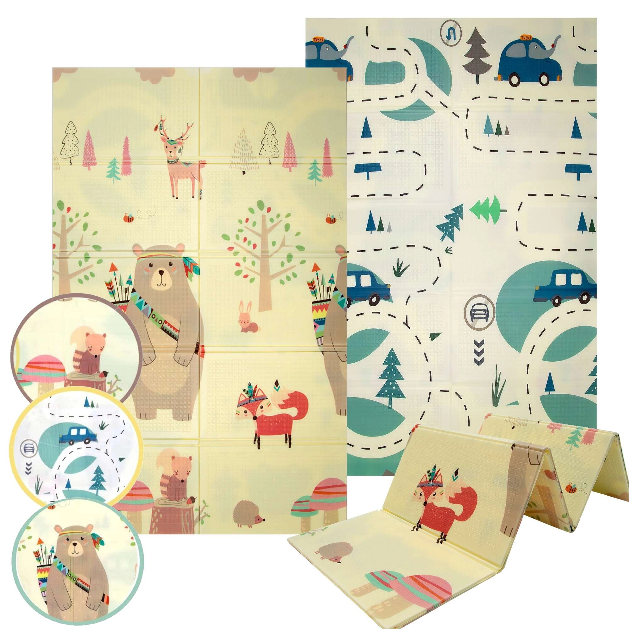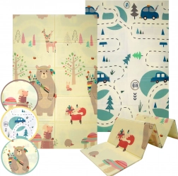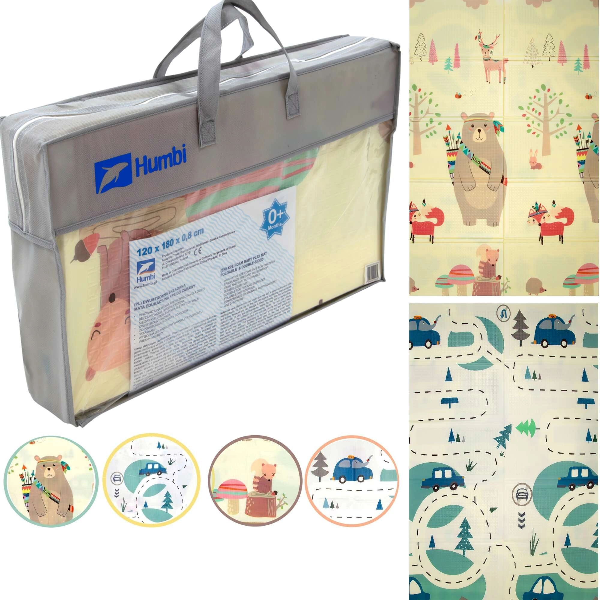 HUMBI-måtten giver børn et blødt og sikkert sted til leg, hvile og motorisk udvikling. Det kvalitetsrige XPE-skum er robust, absorberer stød og isolerer effektivt mod kulde fra gulvet. Det tosidede design byder på skovmotiver (bjørne, ræve, pindsvin) på den ene side og en vej med biler på den anden til sjov kørsel med legebiler og sanseoplevelser.