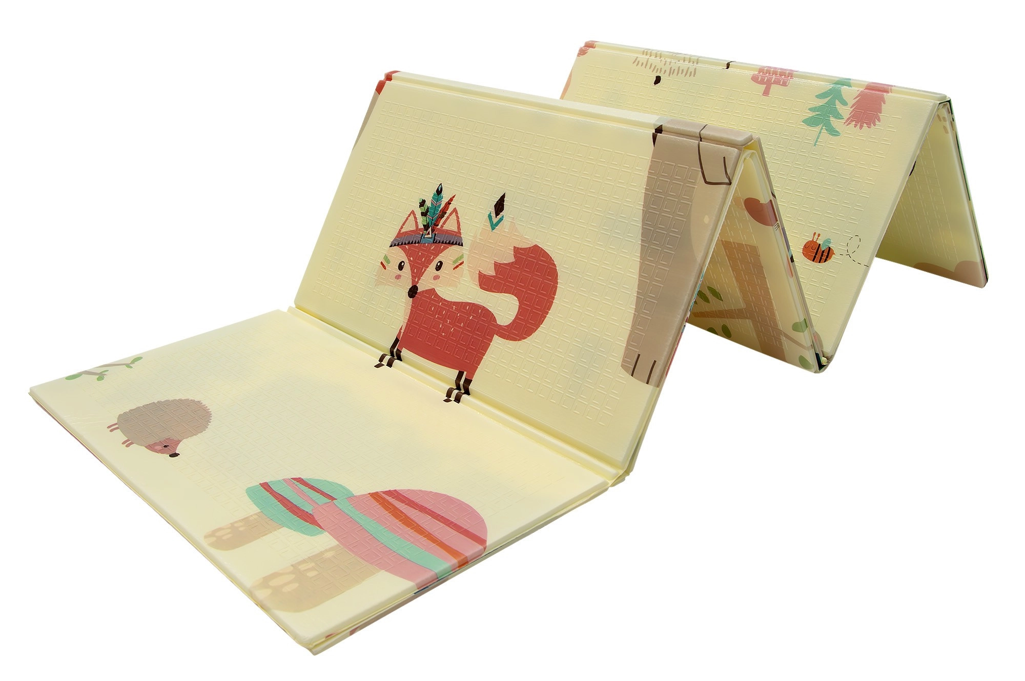 Takket være den foldbare konstruktion kan den foldes på få sekunder og lægges i den medfølgende taske med hank. Den er vandafvisende, nem at rengøre og med en let skridsikker relief, som støtter sikker kravlen og gang. Velegnet til børn fra fødslen, til børneværelset, stuen, altanen og haven.