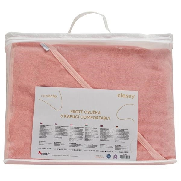 Efter badet er det vigtigt at tørre babyen hurtigt og nænsomt. Det pink hættehåndklæde NEW BABY Comfortably er lavet af kvalitetsfrotté i 100% bomuld, har en to-lags konstruktion for højere sugeevne og lang holdbarhed samt en hætte, der beskytter mod kulde. Materialet afgiver ikke farve og irriterer ikke huden.