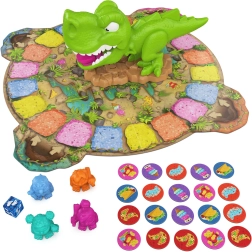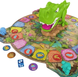Træd ind i en farverig forhistorisk verden, hvor spillerne slår med terning, flytter deres hulefigurer rundt på spillepladen og samler tematiske snacks – fra taco‑daktyl til forhistorisk pizza. I centrum står en stor grøn dinosaurus, hvis interaktive “tunge” kan tage jetoner eller sende modstanderne tilbage.
