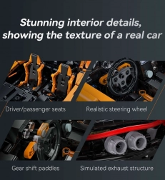 Denne store model fra CaDA Master serien vil begejstre enhver fan af tekniske byggesæt. Superbilen Assassin XR, designet af Pvdb, udmærker sig ved en præcist udformet karrosseri i orange med sorte accenter og imponerende detaljer – fra cockpittet med to sæder og rat til stilfulde udstødninger og realistiske proportioner.