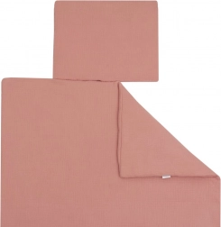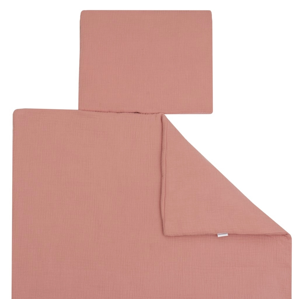Et blødt musselinsæt med fyld til babyer indeholder en pude og en dyne i størrelsen 70 × 80 cm. Det er fremstillet af kvalitetsmusselin og fyldt med antiallergisk fiber, er åndbart, meget let og ekstra skånsomt mod barnets hud. Ideelt til tremmeseng, klapvogn og flettet Moseskurv, med fokus på sikkerhed, komfort og nem pleje.