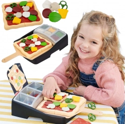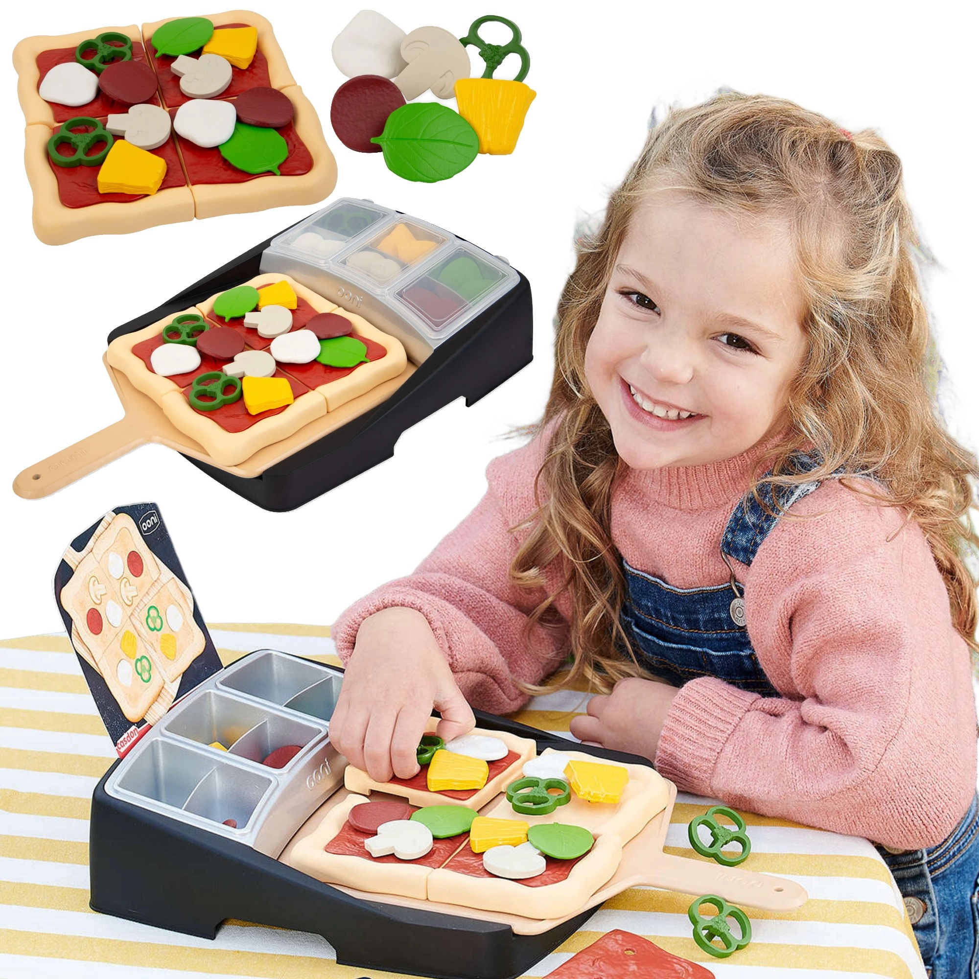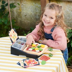 Denne moderne pizzalegesæt til børn giver en realistisk trin-for-trin oplevelse af at lave pizza. Takket være de overskuelige rum til ingredienser kan børn nemt vælge, hvad der hører til på pizzaen, og sammensætte den perfekte kombination efter medfølgende opskrifter eller egen fantasi. De aftagelige dele sættes let fast på bunden og tages af igen, så der kan leges igen og igen.