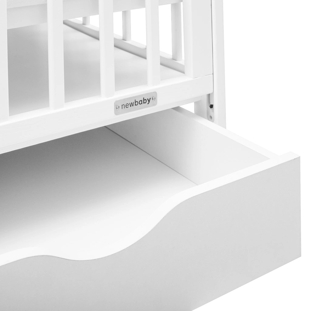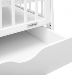 Konstruktionen af 100% fyrretræ med vandbaseret lak er skånsom for både børn og miljø. Den integrerede skuffe på kugleskinner rører ikke gulvet, kan let trækkes helt ud og skubbes ind igen – ideel til opbevaring af sengetøj, bleer og andre nødvendigheder.