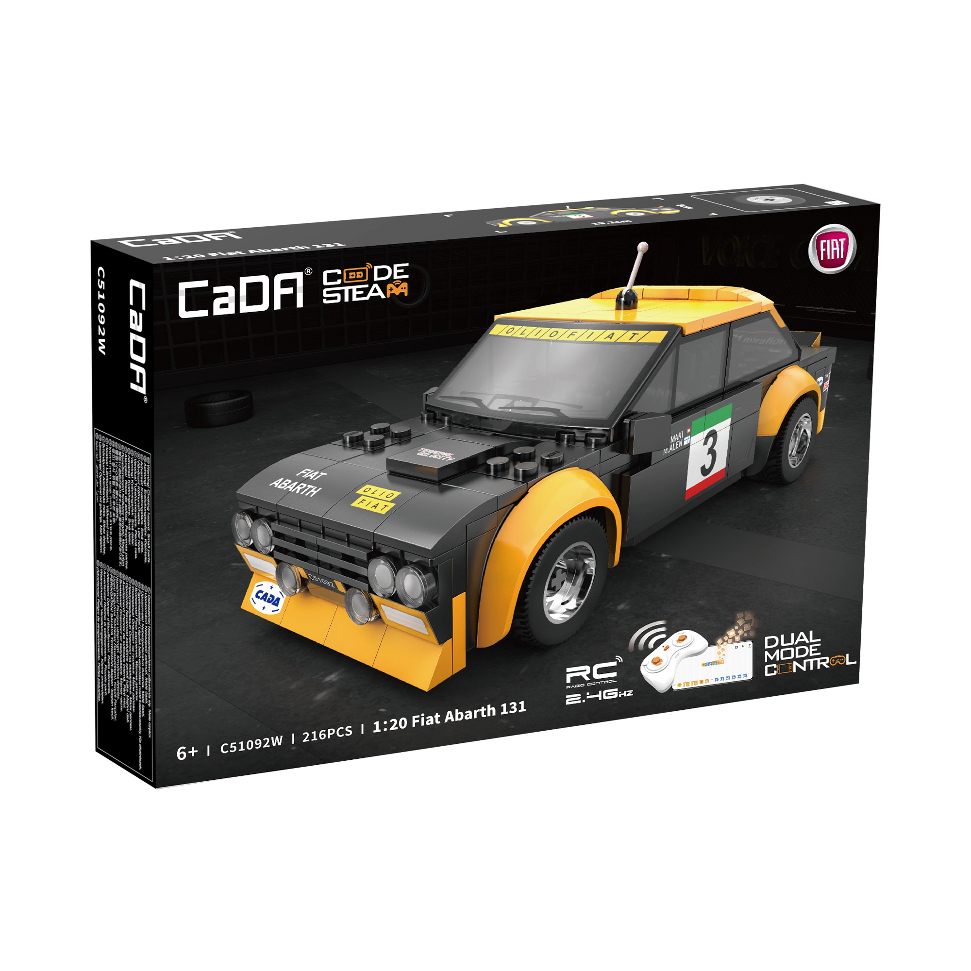 Oplev dynamisk kørsel med den detaljerede model FIAT ABARTH 131 i skala 1:20. Bilen har sort-gul racerlakering med tryk, brede skærme, antenne og realistisk cockpit. Takket være gummihjulene kører den problemfrit på forskellige overflader og når en hastighed på op til 3,8 km/t.