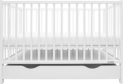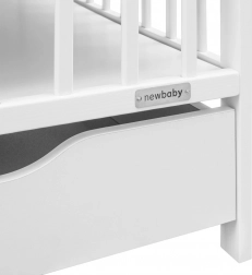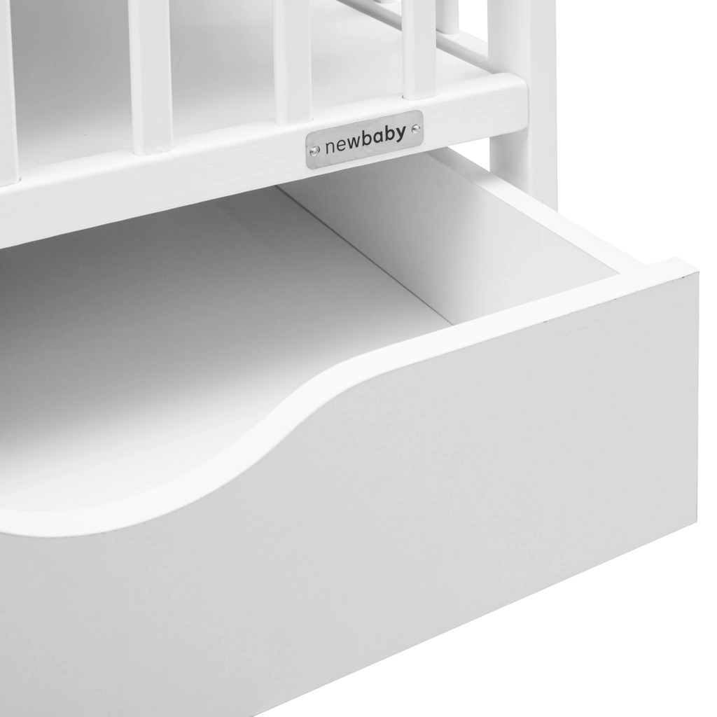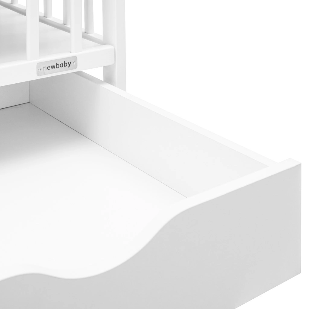 Den indbyggede skuffe giver rigeligt med plads til opbevaring af sengetøj og babyudstyr. Den glider let og rører ikke gulvet.