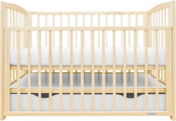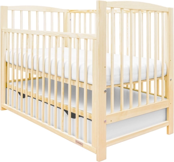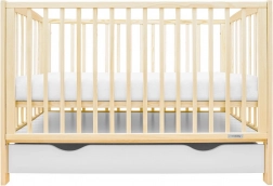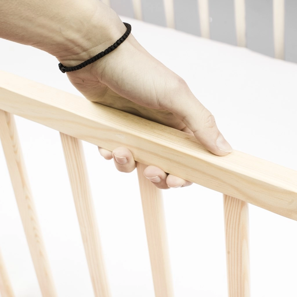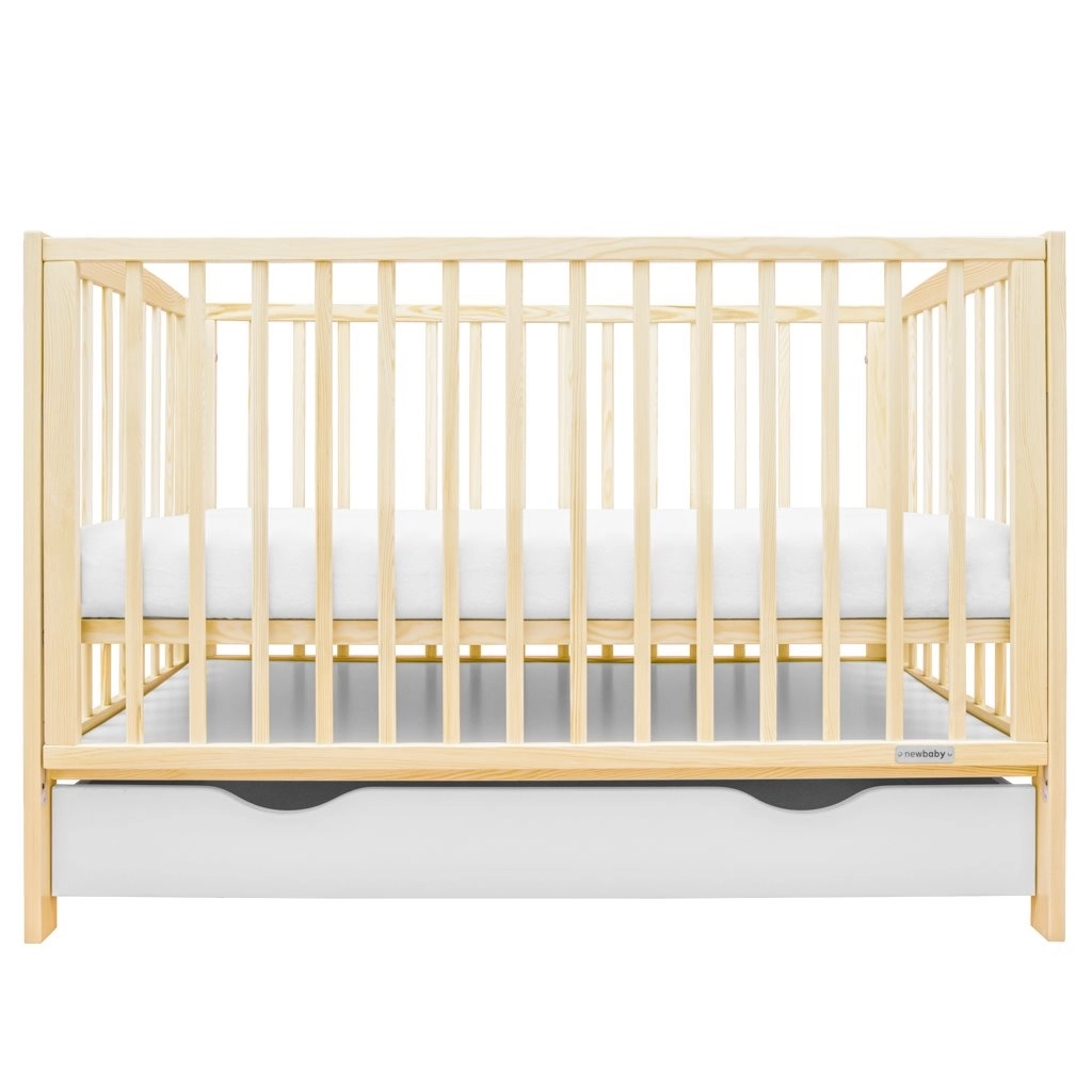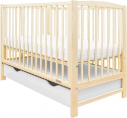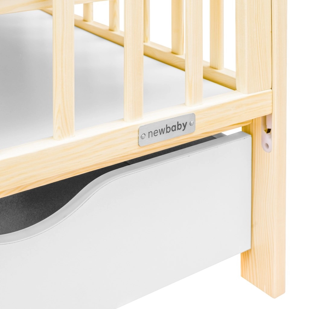 Praktisk og sikker babyseng i naturligt fyrretræ med en ny nedfældbar sideskinne, 3 madrashøjder og en rumlig skuffe på skinner. Certificering EN 716 og skånsom vandbaseret lak sikrer tryg søvn og lang levetid.