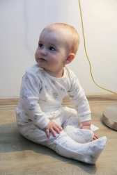 Praktiske detaljer gør hverdagen lettere: trykknapper på skulderen og i skridtet gør påklædning og bleskift hurtigt og uden stress. De lange ærmer holder den lille varm hele dagen.