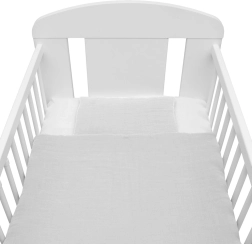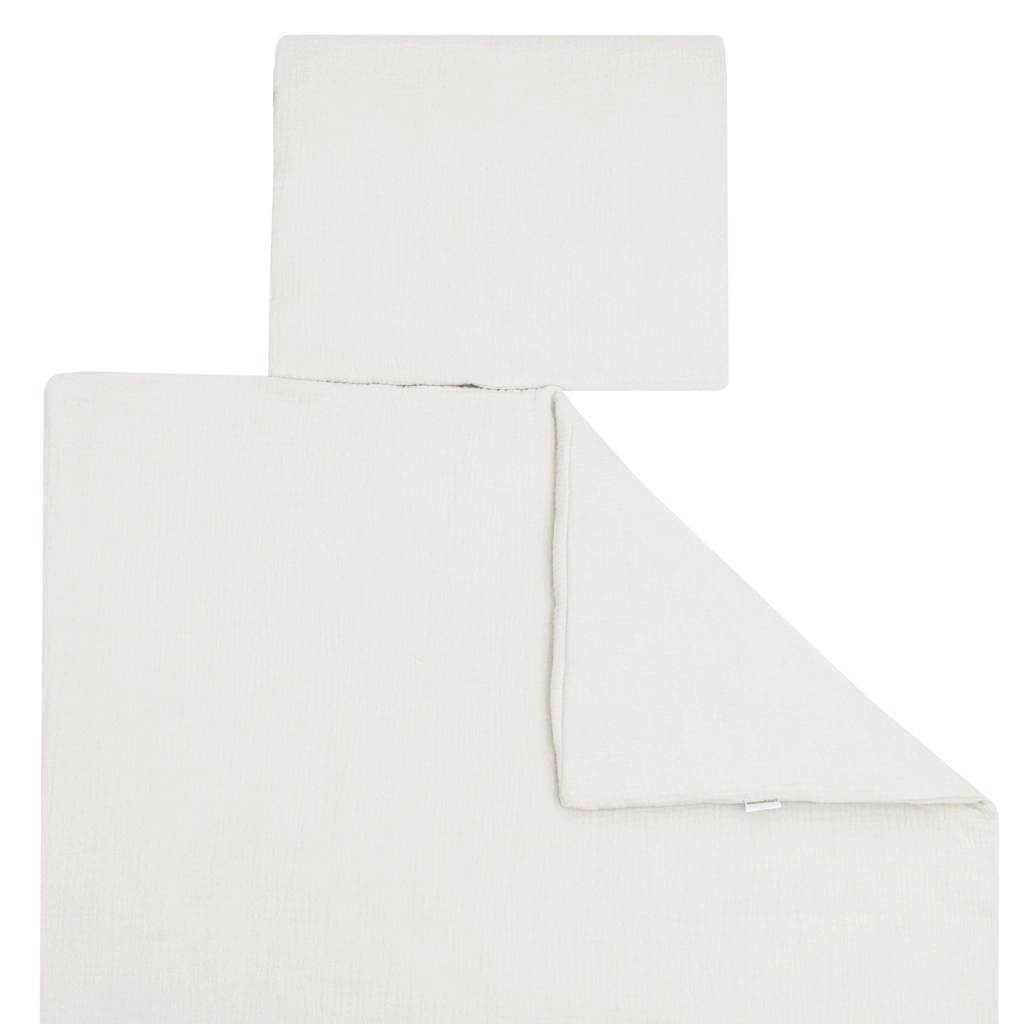 Det bløde muslinsæt med fyld til babyer indeholder en pude og en dyne, ideel til tremmeseng, barnevogn og Moseskurv. Det er lavet af kvalitetsmuslin med antiallergisk fyld, som er åndbart, blidt mod barnets hud og sikrer behagelig søvn fra de allerførste dage. Alle materialer er testet og opfylder OEKO‑TEX STANDARD 100.