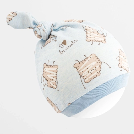 En stilfuld og behagelig hue til baby fra kollektionen Biscuits i blå farve – perfekt til hverdagsbrug. Allover-printet med søde småkager giver et legende udtryk, mens den lille knude på toppen er en fin detalje, der glæder ved første blik.