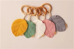 New Baby Leaf bideringen i grå er designet til at tilbyde sikker og behagelig gumlen og samtidig berolige gummerne. Træringen af bøgetræ er glat og holdbar, og musselinbleen af økologisk bomuld er blød, åndbar og behagelig at røre ved.