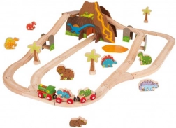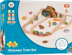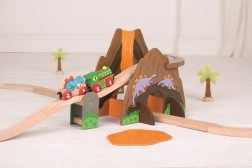 Tag på forhistorisk eventyr med en togbane, hvor jernbanen møder dinosaurer. Børn kan bygge en rundstrækning omkring en vulkan med tunnel, køre med dinosaurtoget og skabe deres egne historier med de farvestrålende figurer. Trædelene er robuste, behagelige at røre ved og ideelle til daglig leg.