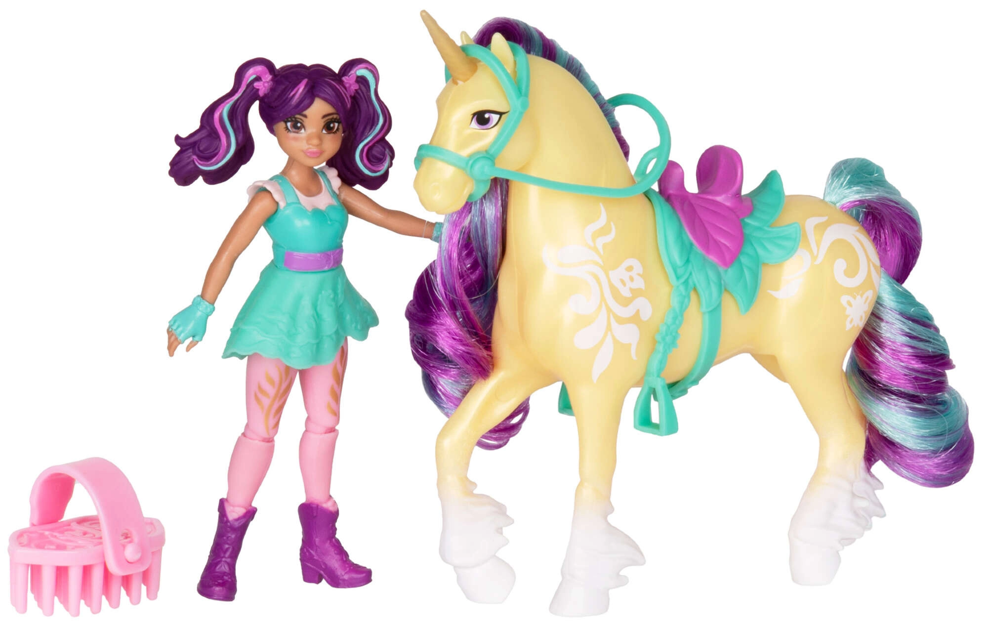 Der følger en børste med, så børn kan style manke og hale og skabe nye frisurer. Sættet er perfekt til både solo- og fællesleg, udvider ordforrådet, understøtter fantasifulde fortællinger og er et fantastisk supplement til UNICORN ACADEMY-samlingen.
