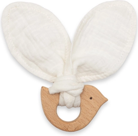 Babybideringen NEW BABY Bird white kombinerer naturligt bøgetræ og blød musselinstof af 100% økologisk bomuld. Den fastere trædel hjælper med at massere gummerne og lindre spændinger, mens den bløde musselin giver en behagelig berøring og kan bruges til nænsomt at tørre savl.