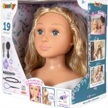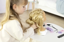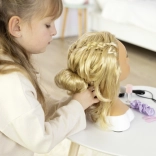 Dette realistiske stylinghoved er et ideelt redskab til små frisører og makeupartister. De lange, skinnende syntetiske blonde hår holder formen, kan gentagne gange redes, flettes og styles til et væld af frisurer. Den stabile base gør arbejdet lettere, og tilbehør som børste, kam, spænder, elastikker og fletteværktøjer åbner døren til ubegrænset kreativitet.