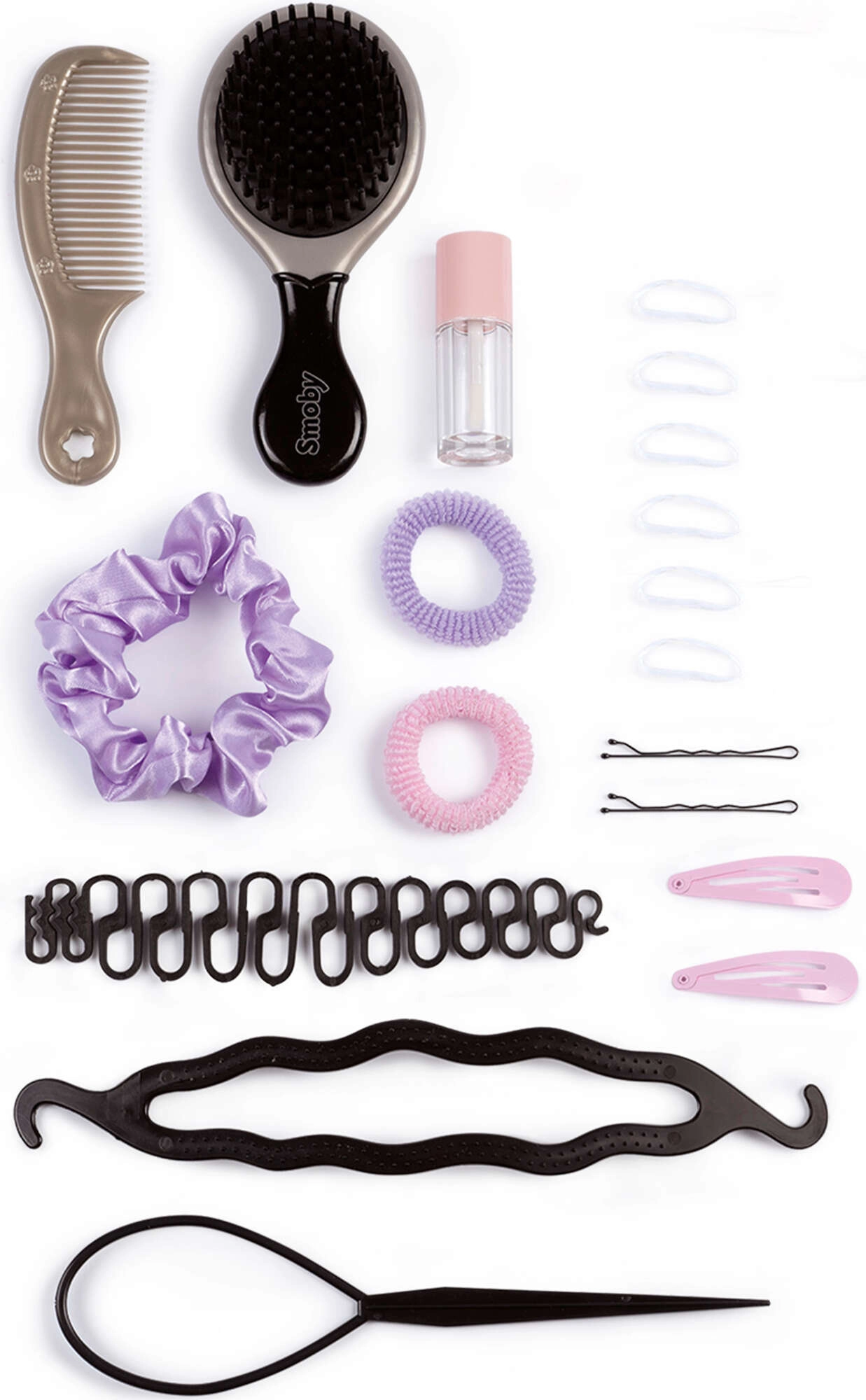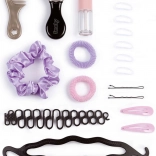 Børste, kam, hårelastikker, spænder, hårnåle, gennemsigtige elastikker og særlige værktøjer til fletning for nem skabelse af frisurer.