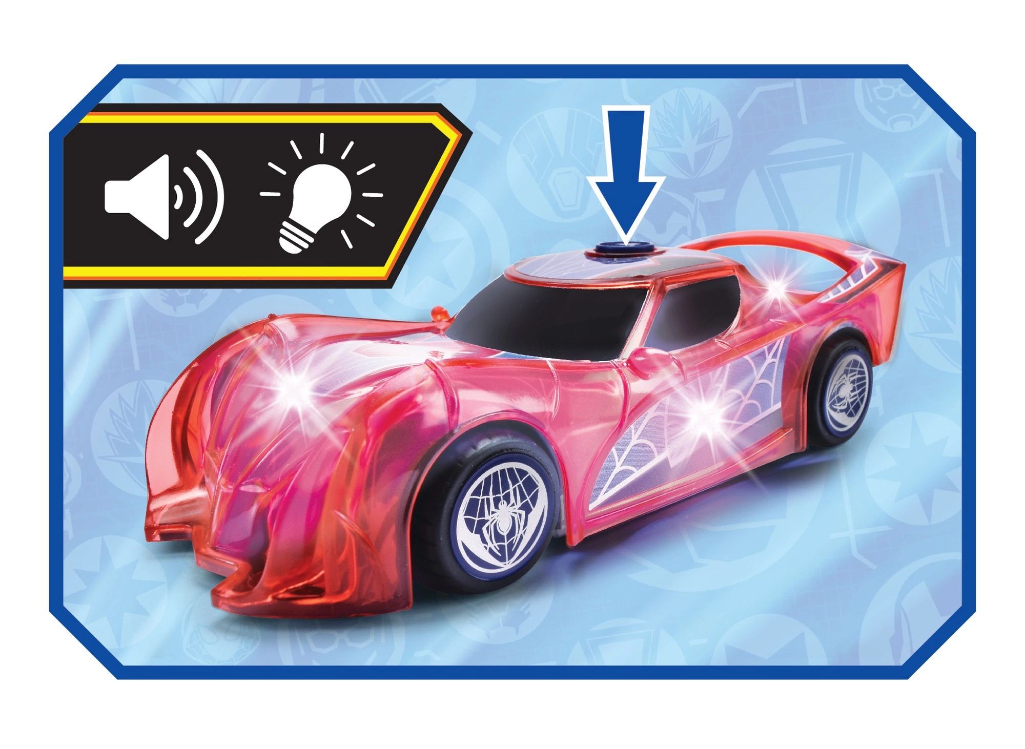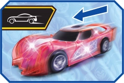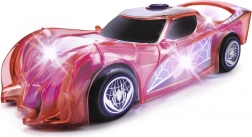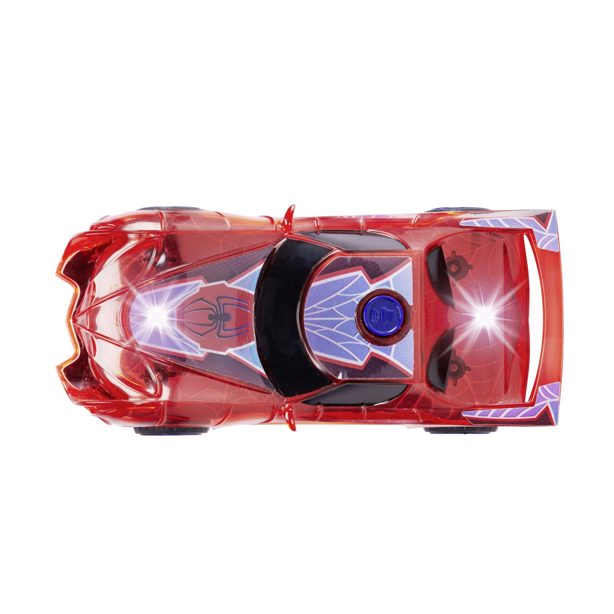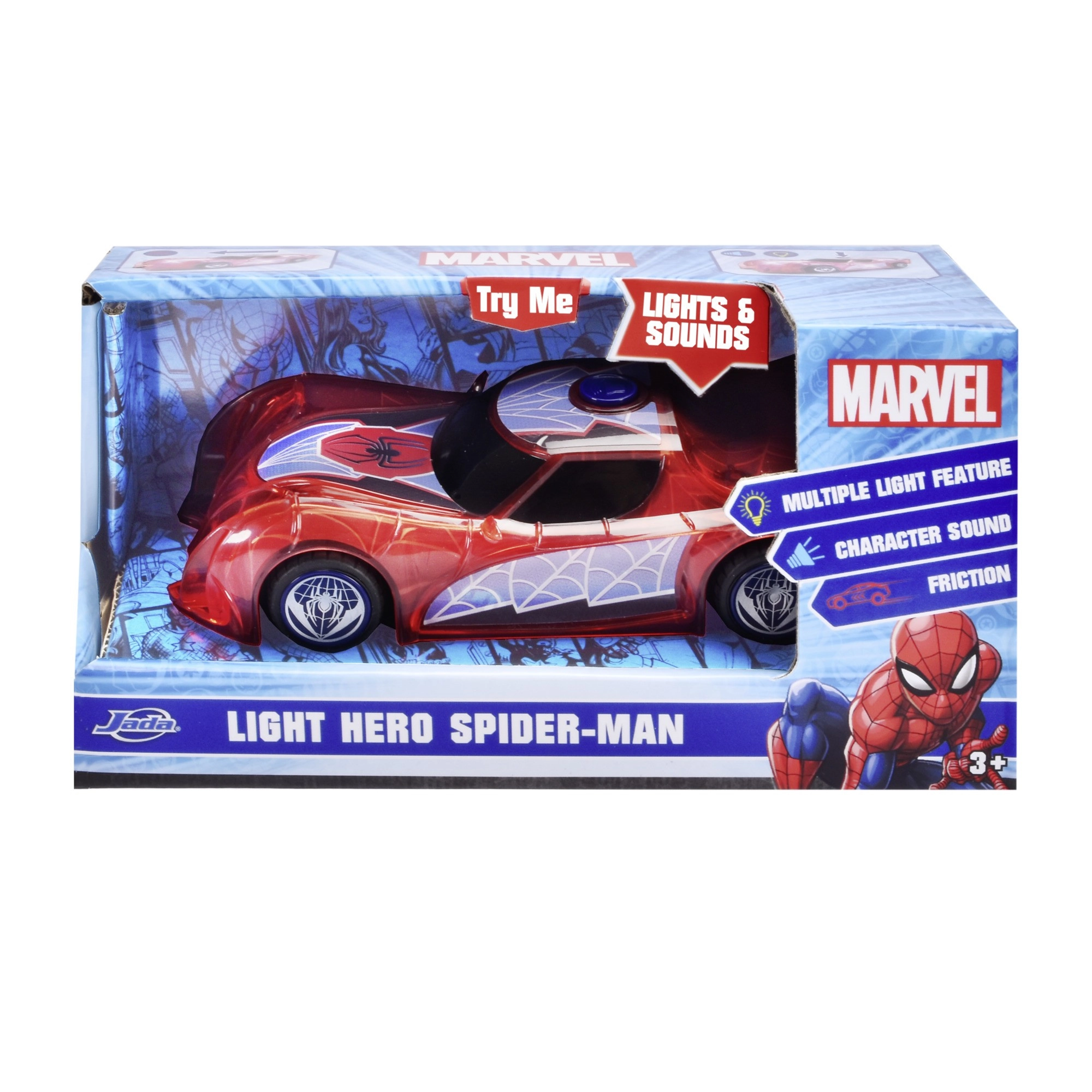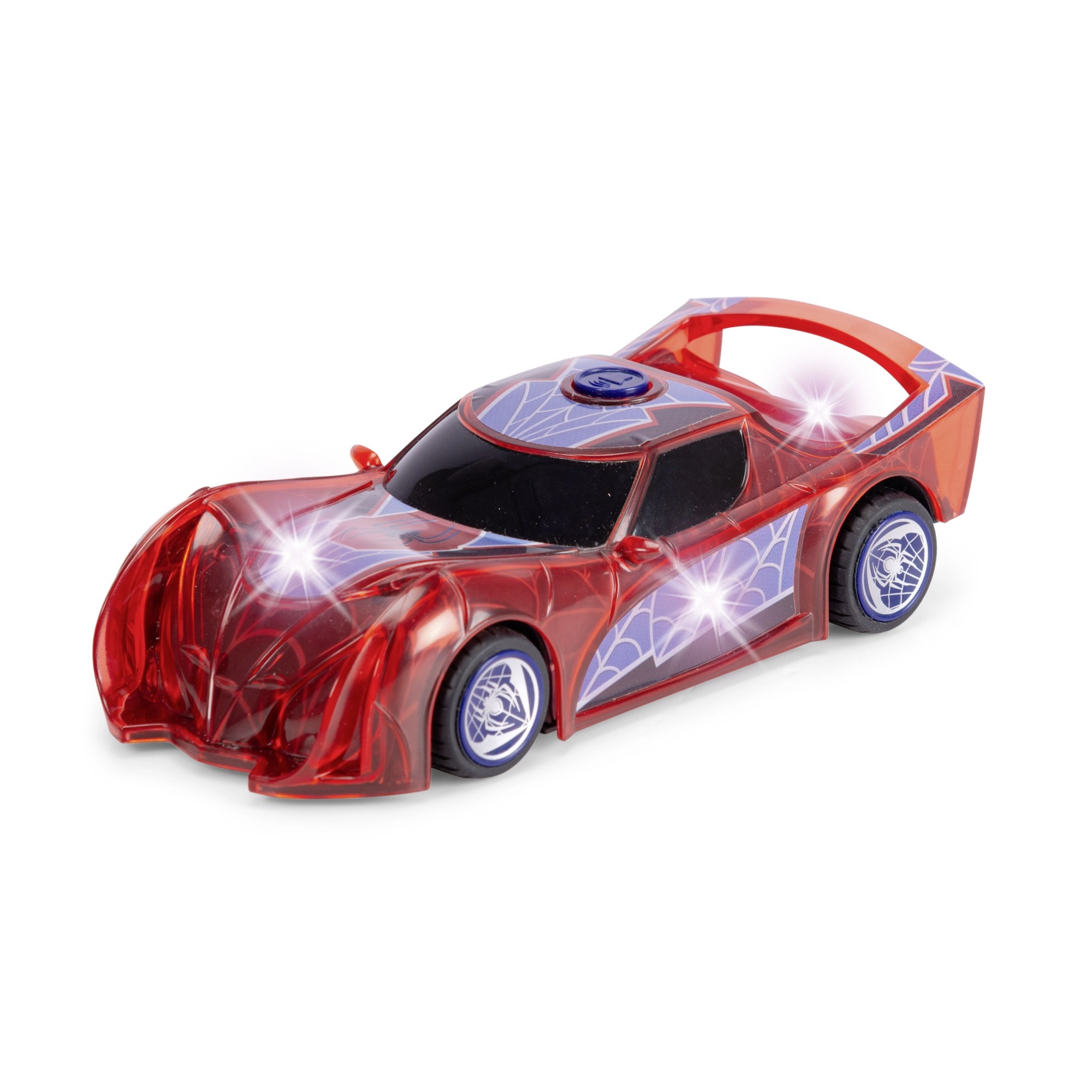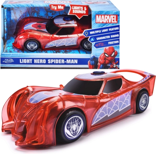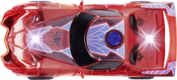 Superheltebilen SPIDER‑MAN i den karakteristiske røde farve og med spindelvævsdetaljer skiller sig ud med sit halvgennemsigtige design og indbyggede LED‑lys, der lyser ethvert eventyr op. Den enkle push‑and‑go-mekanisme (friktionsdrev) kræver blot et let skub, så suser bilen frem.