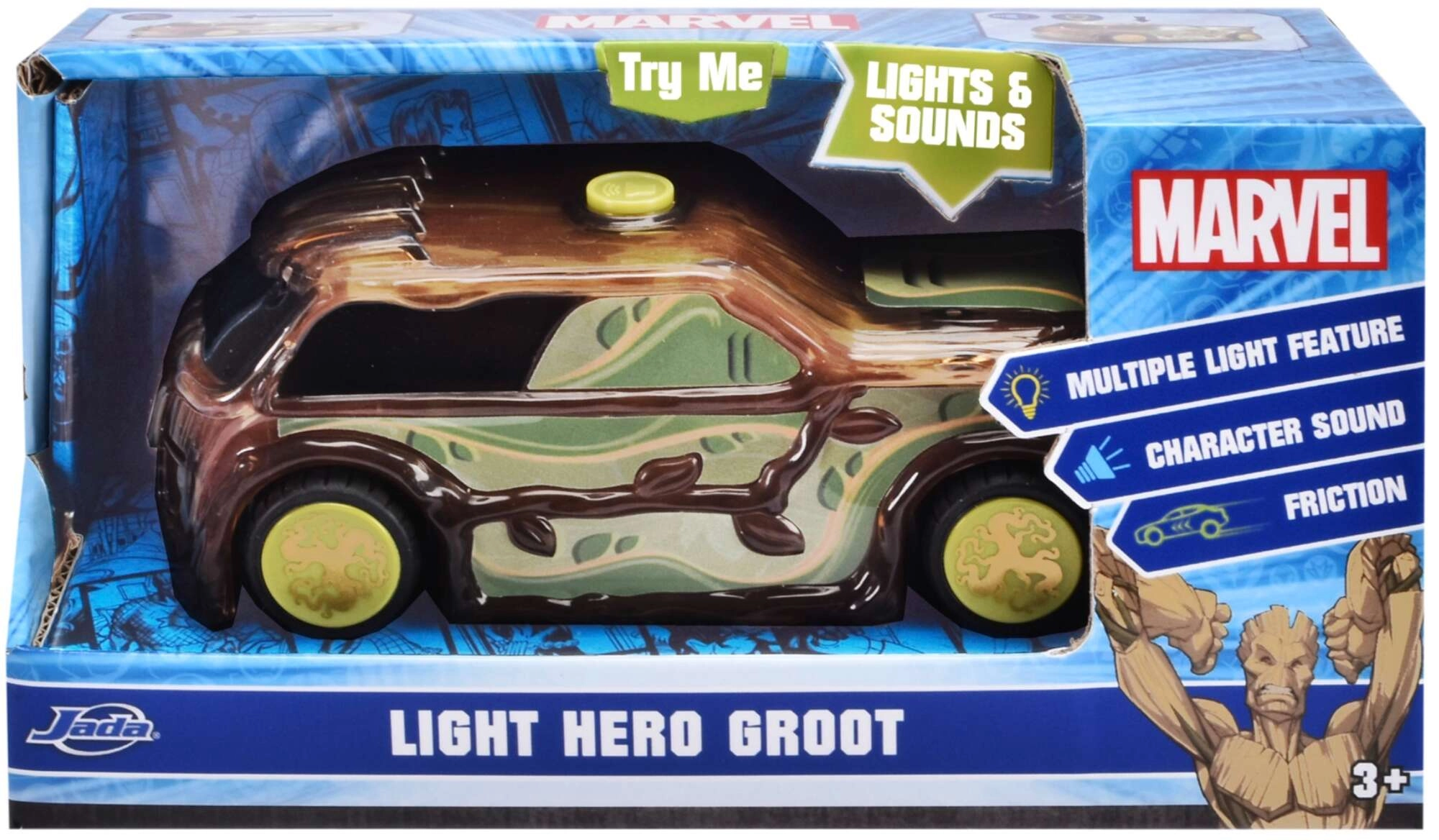 Oplev den actionfyldte bil med GROOT fra MARVEL, som kombinerer interaktive lys- og lydeffekter med et originalt naturinspireret design med træ, blade og kviste. Børn aktiverer nemt effekterne ved at trykke på den gule knap på taget og kan begive sig ud på eventyrlige Avenger-missioner.