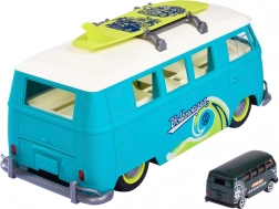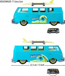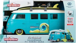 Den store interaktive Volkswagen T1 fra MAJORETTE imponerer med præcis udførelse og autentiske detaljer fra den legendariske camper. Bæretasken i form af en varevogn i turkisgrøn med cremefarvede elementer åbner sig til en praktisk lege-kuffert med parkeringspladser til den medfølgende mini-bil. Frontknappen i form af VW-logoet aktiverer klare lys.