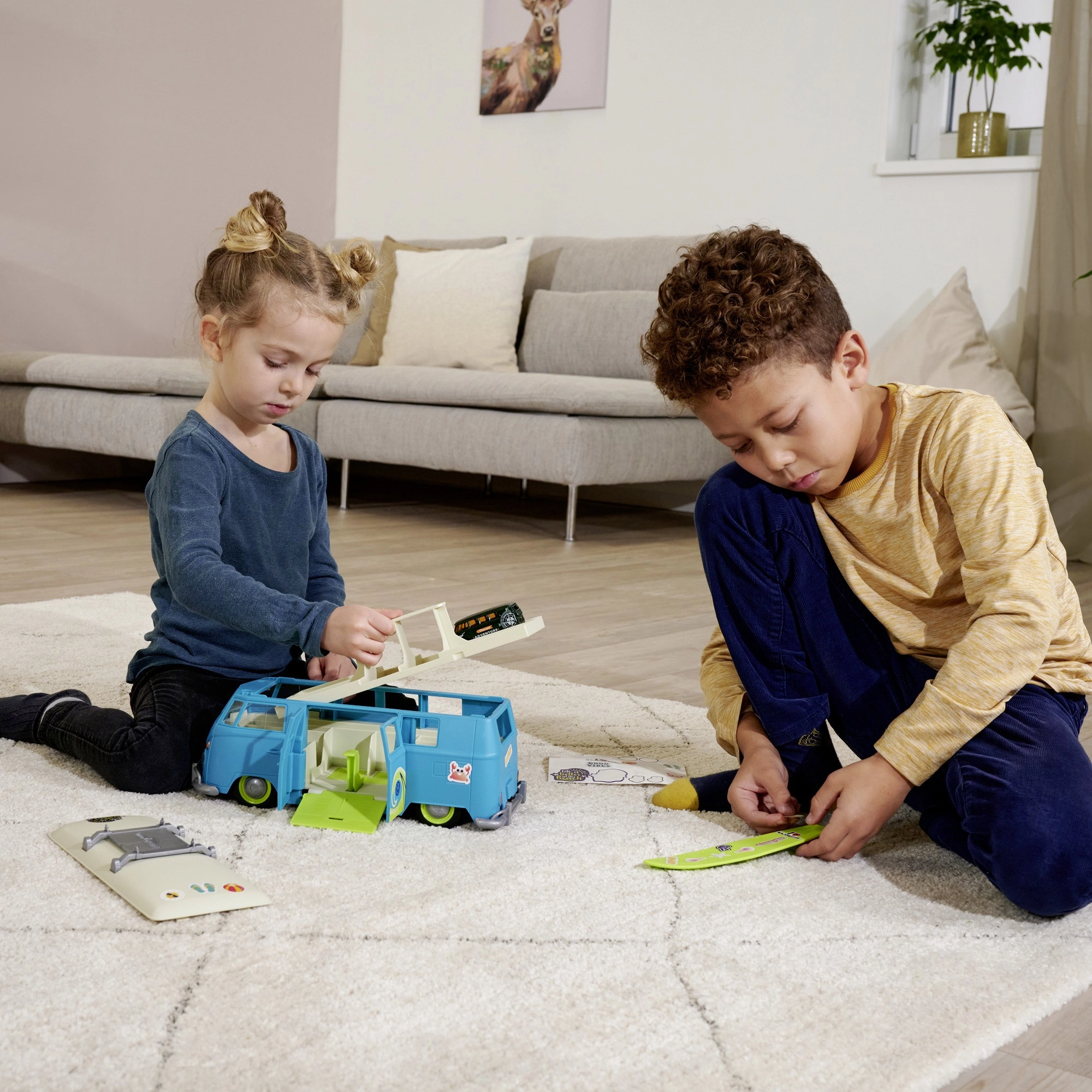 Taget er aftageligt, på tagbøjlen finder du et aftageligt surfbræt, og den bageste del har en opklappelig flap med “motorrum”. Det robuste plastdesign egner sig til daglig leg og udvikler finmotorik og fantasi hos børn fra 3 år.