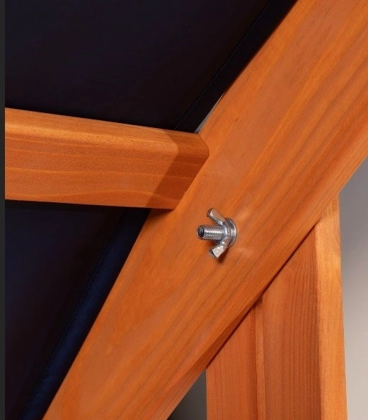 Alle trædele er beskyttet af en godkendt vandbaseret imprægnering, der er egnet til børn. Takket være mikropigmenter bevarer baldakinen et attraktivt udseende i længden og modstandsdygtighed over for vejrpåvirkninger. Konstruktionen er forberedt til hurtig installation – forborede huller, monteringsmateriale og trykt vejledning følger med i pakken.