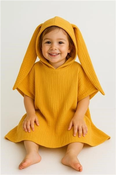Børne-musselinponchoen NEW BABY Feeling er en fantastisk ledsager efter badet og til sommerlige vandlege. Takket være dobbeltlags musselin i 100% bomuld er den let, åndbar og tørrer hurtigt, så dit barn holdes varmt og komfortabelt. Den praktiske hætte med ører beskytter hovedet og giver ponchoen et nuttet look.