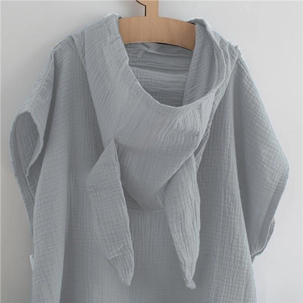 Let og behagelig børne-musselinponcho NEW BABY Feeling i lysegrå farve er ideel efter badet derhjemme, ved poolen og ved vandet. Takket være 100% bomuld er den luftig, absorberende og blid mod huden. En hætte med søde ører og en løs pasform, der vokser med barnet, sikrer komfort. Trykknapper i siden for nem påklædning giver mulighed for at lade ponchoen være løs eller lave en åbning til armen.