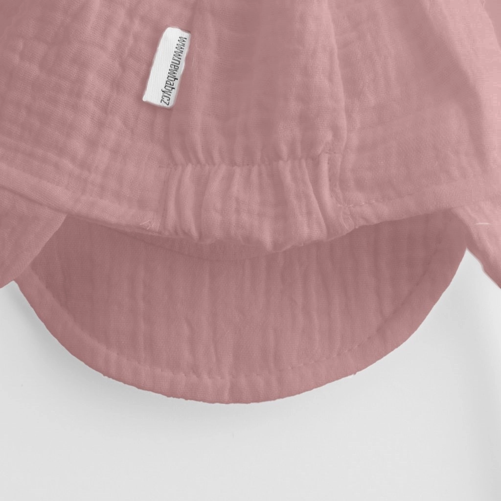 Den sommerlige musselinhue med skygge NEW BABY er ideel til solrige dage. Skyggen giver behagelig skygge, så den beskytter øjne og ansigt, mens faconen over ørerne sikrer komfort selv ved længere tids brug. Takket være let og åndbar musselin undgås overophedning, og barnet forbliver komfortabelt hele dagen.