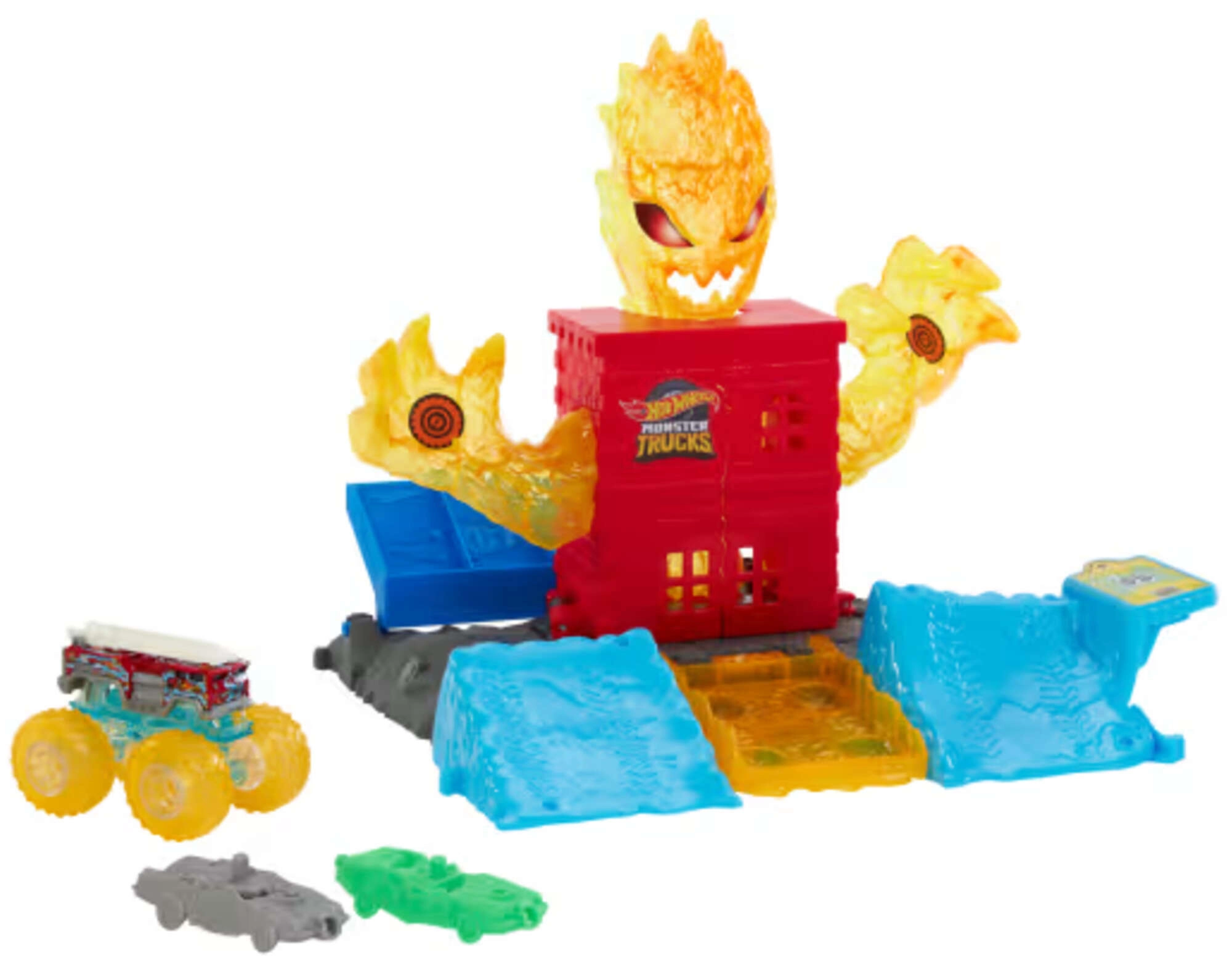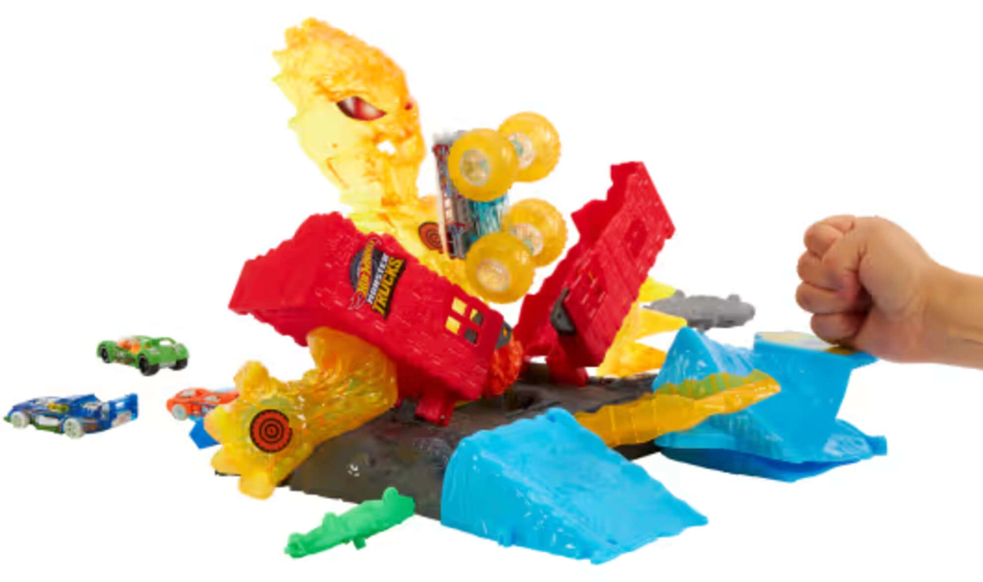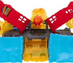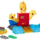 Hersk over arenaen med et centralt ildtårn, en fjederdrevet affyrer og interaktive forhindringer. Hvert præcist træf udløser en effektfuld eksplosion, svingende porte eller faldende dele – perfekt til at træne præcision og til konkurrencer med venner. Den ideelle gave til fans af HOT WHEELS og monstertrucks.