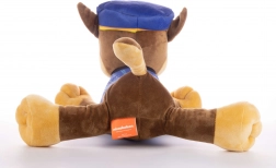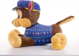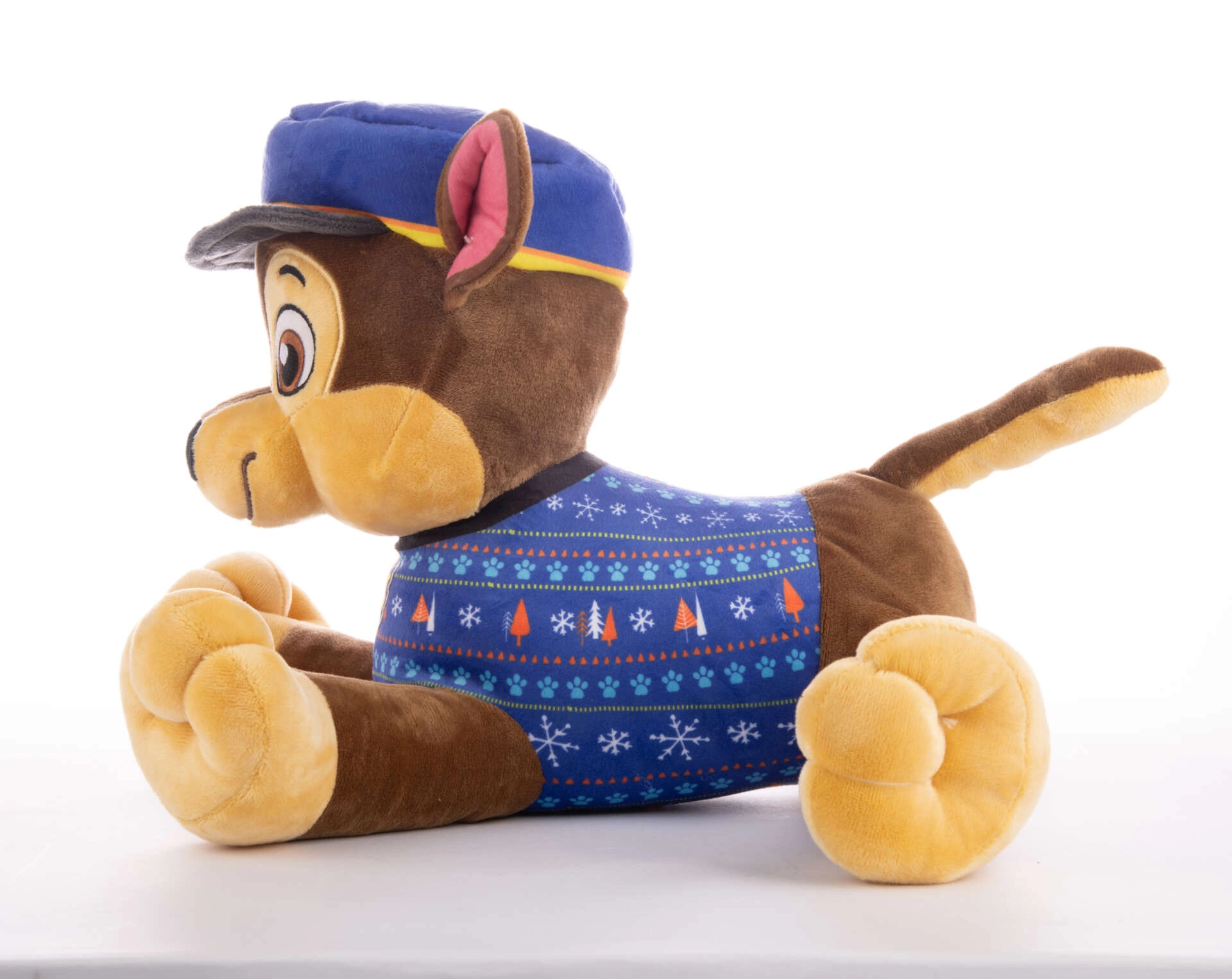 Plys-hundepolitiet Chase er trofast inspireret af serien Paw Patrol. Med store broderede øjne, blå politihue og sweater med snefnug og træer virker den meget autentisk. Den liggende position med strakte poter gør den til den perfekte makker til kram, søvn og leg.