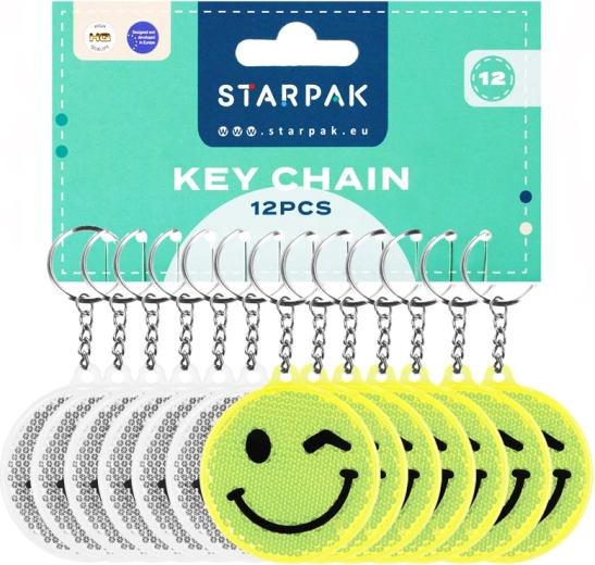 Refleksvedhænget med smiley kombinerer sikkerhed og stil. Den markante refleksive overflade hjælper dig med at blive set bedre, når du går eller cykler, mens det legende smiley-motiv glæder både børn og voksne. En praktisk metalkrans med kort kæde gør det nemt at sætte fast på nøgler, lynlås, rygsæk eller skoletaske.