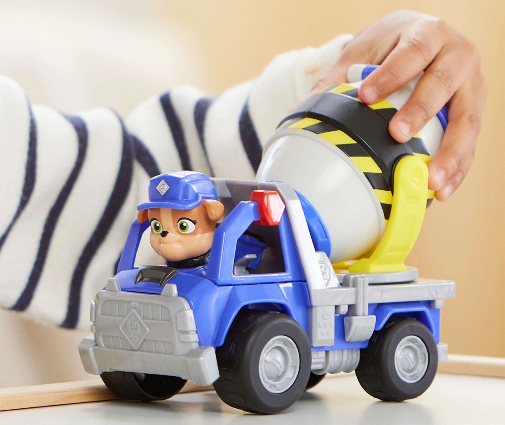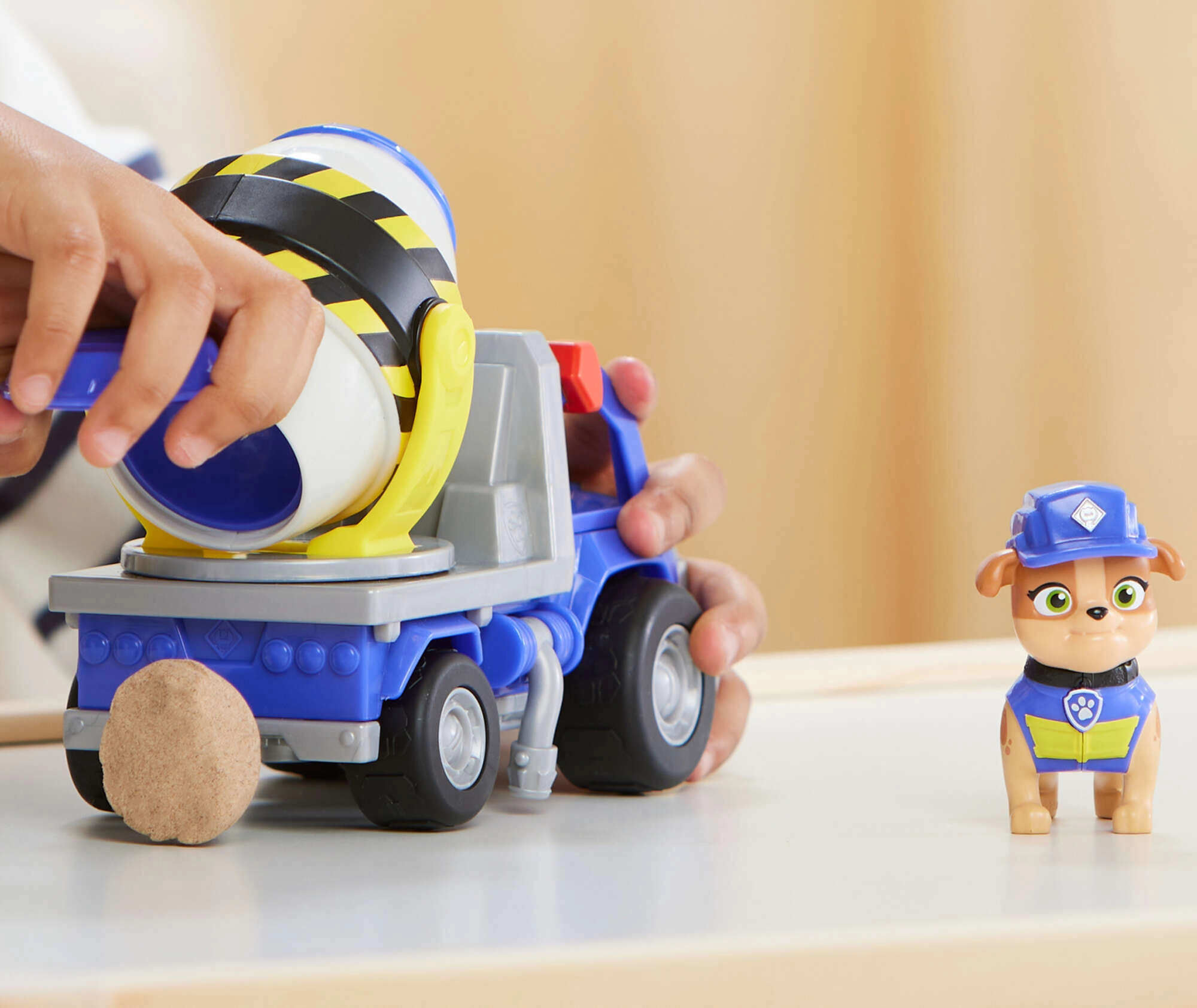 Træd ind på byggepladsen med heltene fra PAW PATROL! Den blå betonblander med kendetegnende gul‑sorte striber på tromlen og hundefiguren Mix er klar til aktion. Børn kan manuelt dreje tromlen og transportere “beton” til stedet, mens de store robuste hjul sikrer en jævn tur på forskellige underlag.