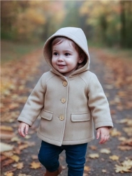 Moderne design, træknapper og et lidt kraftigere stof gør frakken alsidig til gåture, børnehave og festlige lejligheder. Hætten beskytter hoved og ører og sikrer komfort i omskifteligt vejr.