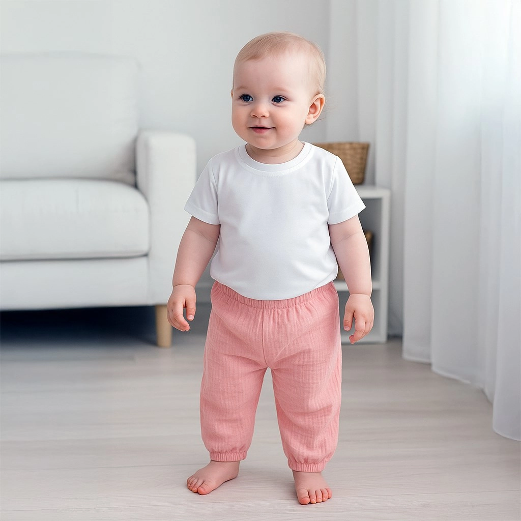 Oplev komfort og funktion i ét. Dette børnesæt kombinerer en blød bomulds-T-shirt uden lukning med en fin halskant og moderne ensfarvede musselinbukser med løs pasform. Takket være det lette, luftige materiale er sættet ideelt til heldagsbrug hjemme, ude og i børnehaven.