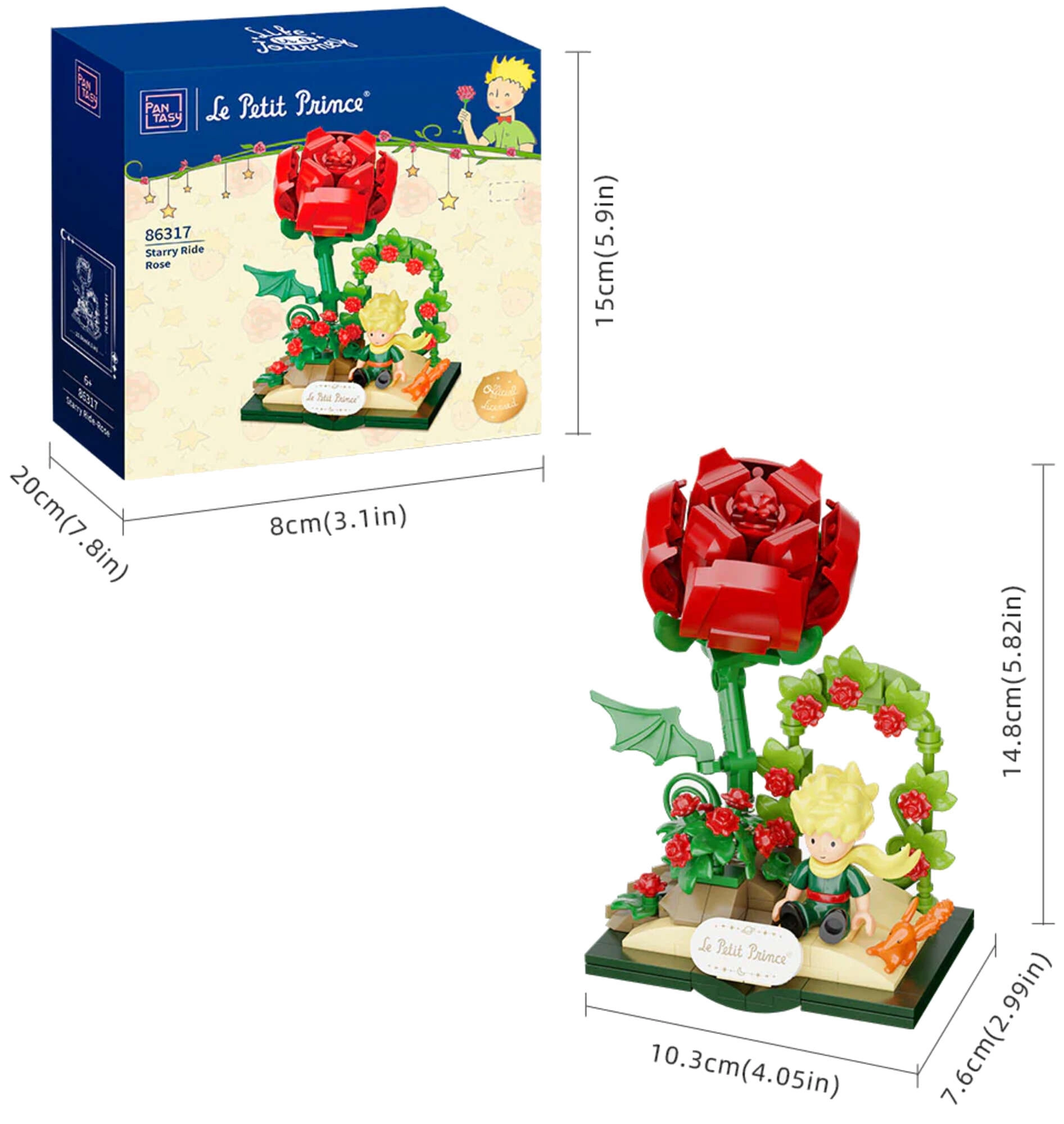 Dette designbyggesæt bringer den ikoniske røde rose og figuren Den Lille Prins med ræven til live i en poetisk scene. Takket være de trykte detaljer træder farver og fine motiver tydeligt frem, og modellen bevarer sit premium-look over tid. Den færdige dekoration måler 14,8 × 10,3 × 7,6 cm og pryder skrivebordet, hylden eller børneværelset.