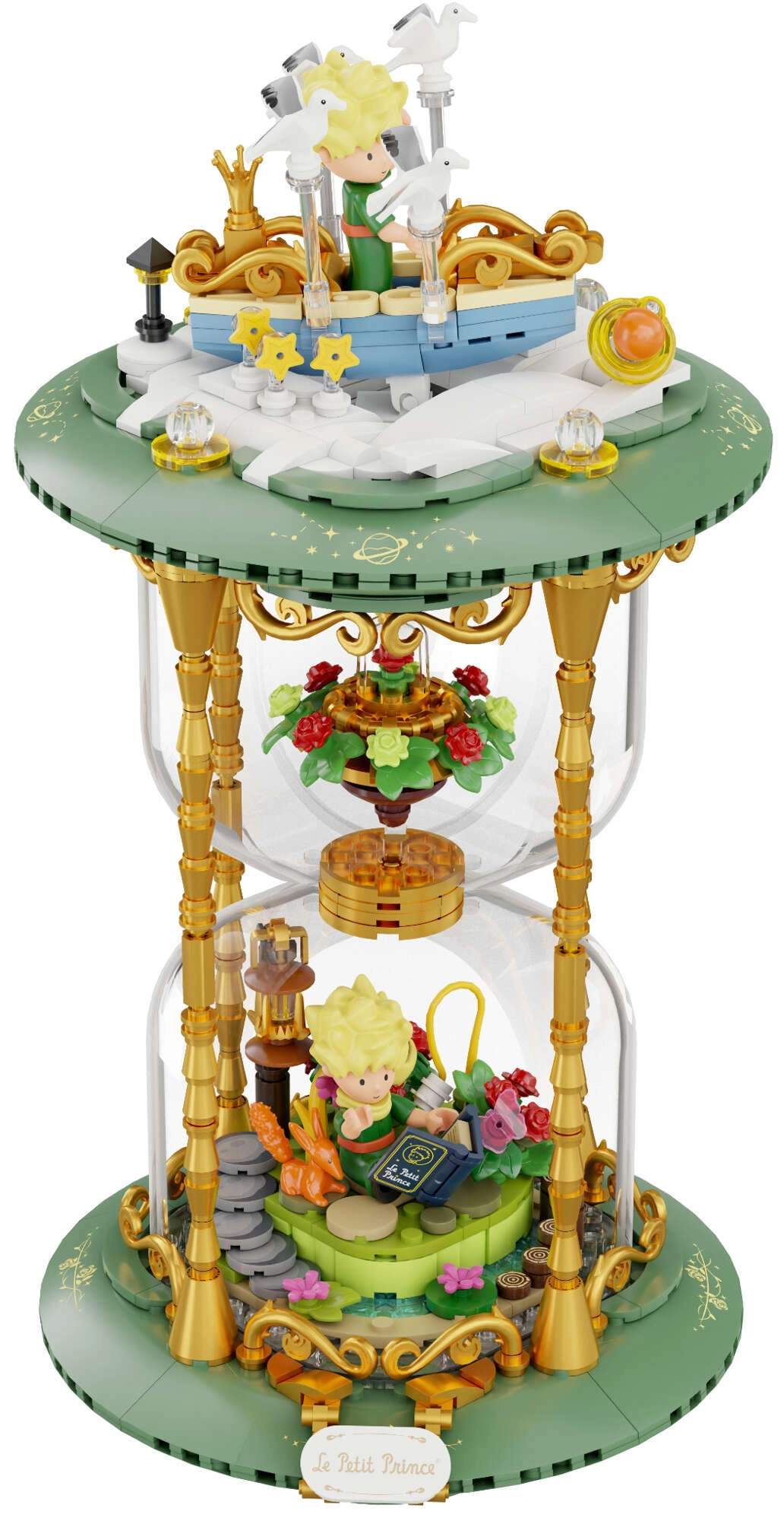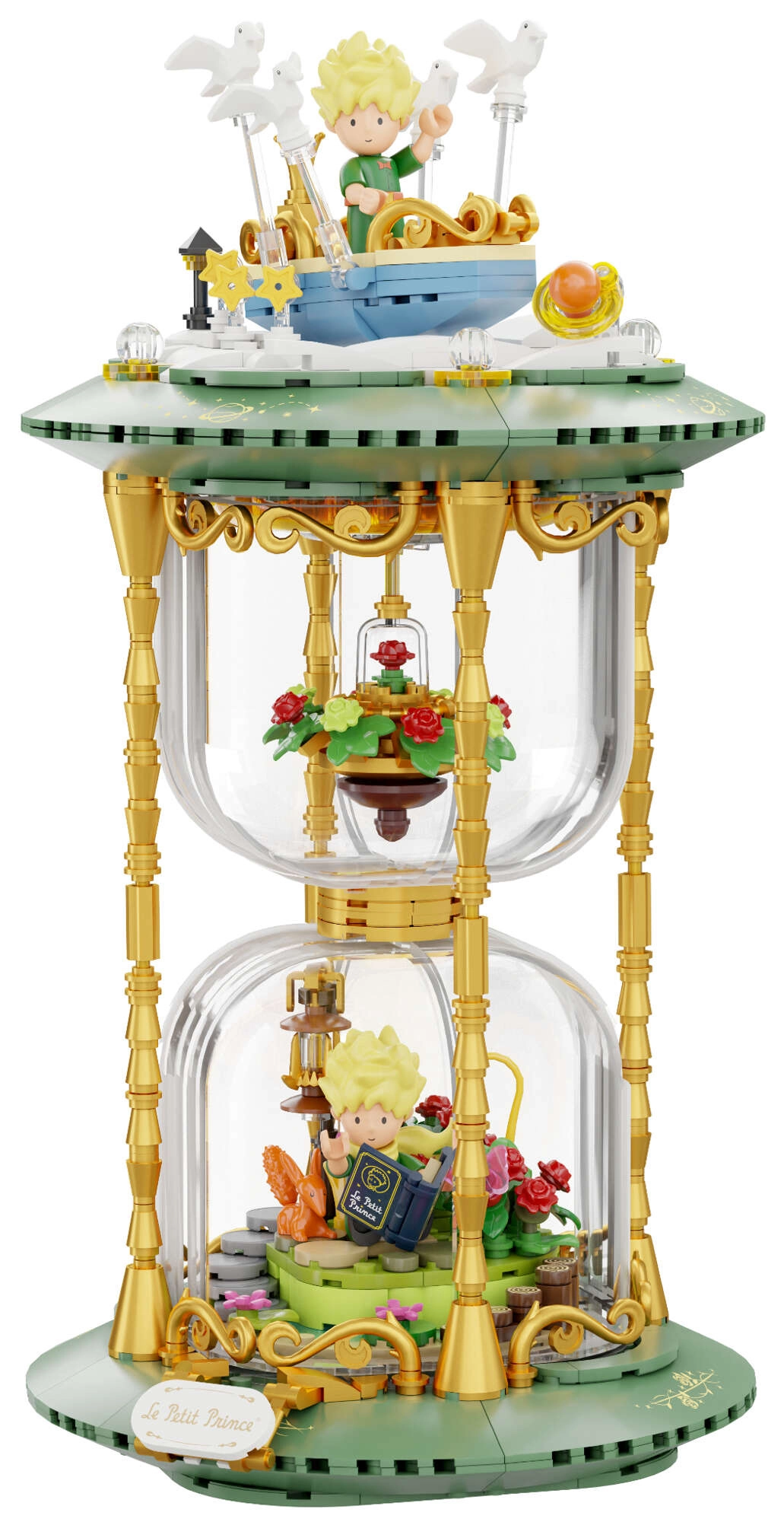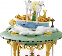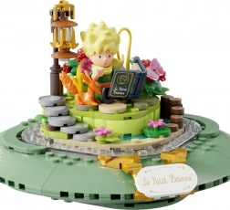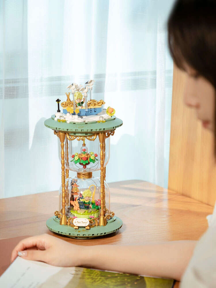 Dette udstillingsvenlige byggesæt i form af et stilfuldt timeglas forener poesien fra det tidløse værk med moderne design. Grønne sokler, gyldne søjler og gennemsigtige kamre med mini-scener skaber et effektfuldt diorama – Den Lille Prins, ræven, rosen under glaskuppel og stjernehimlen. Takket være præcis pasform og trykte mønstre bevarer modellen et rent udseende i mange år.
