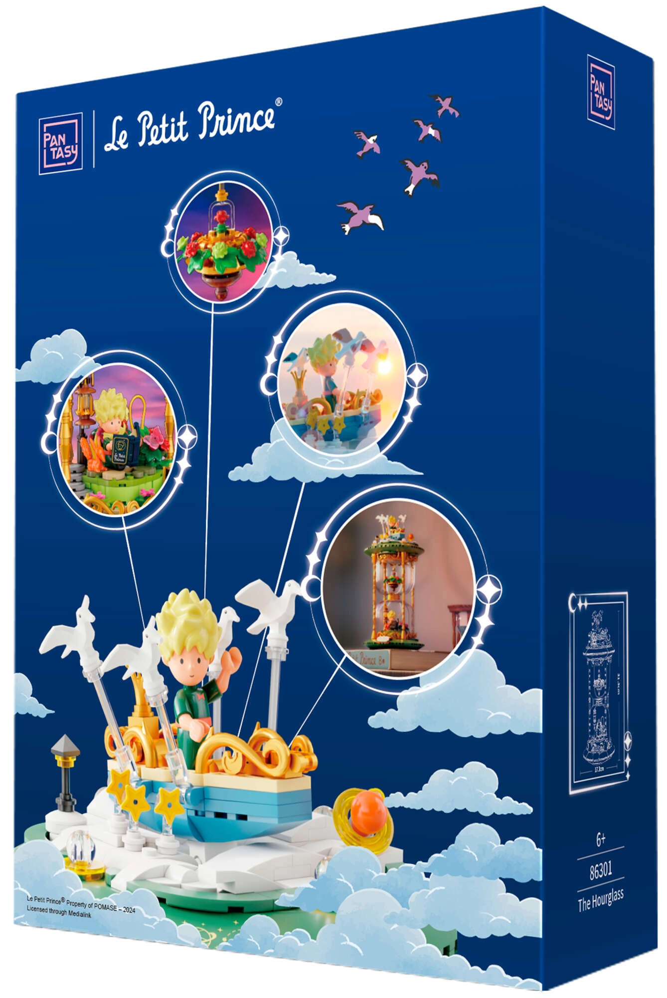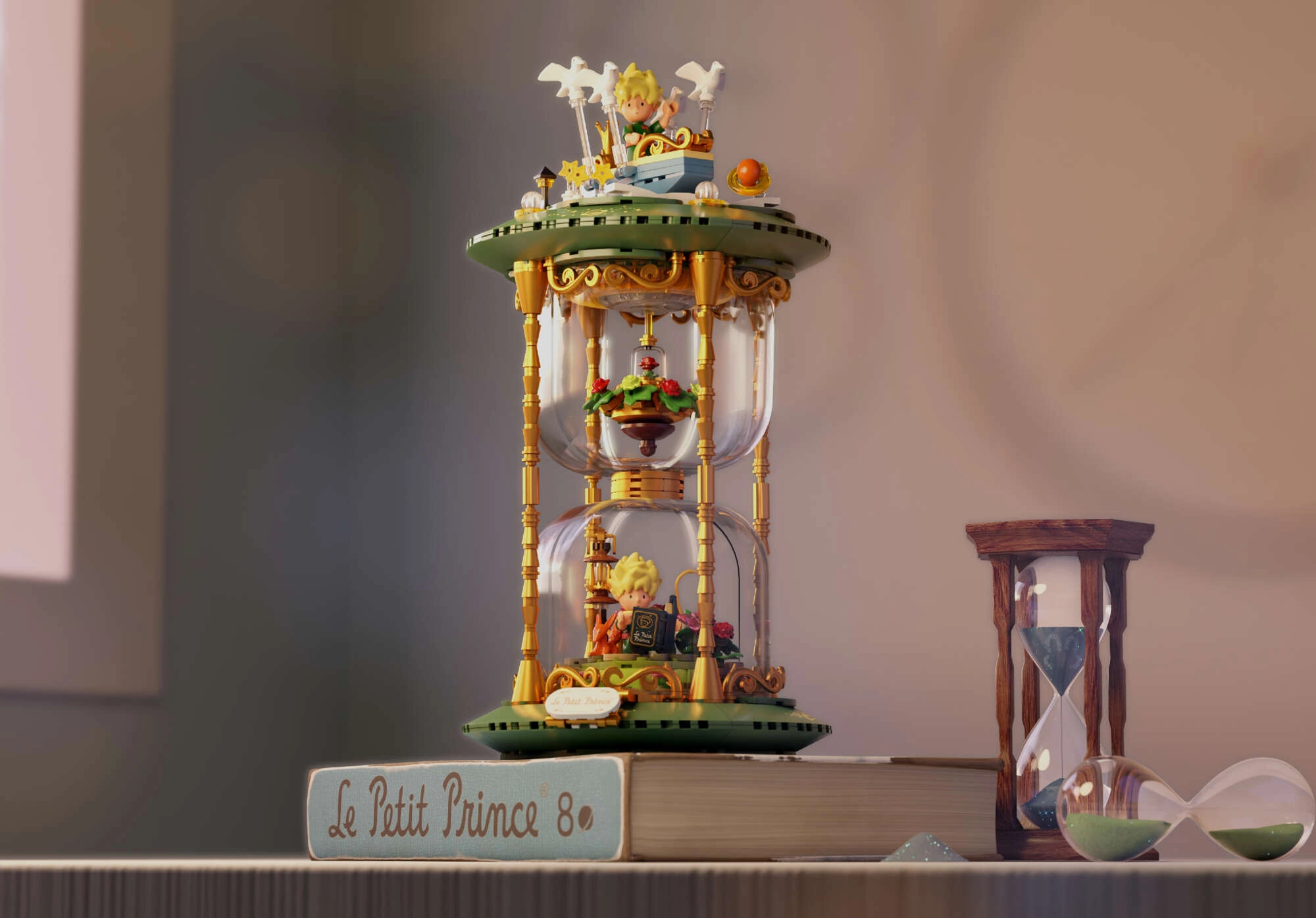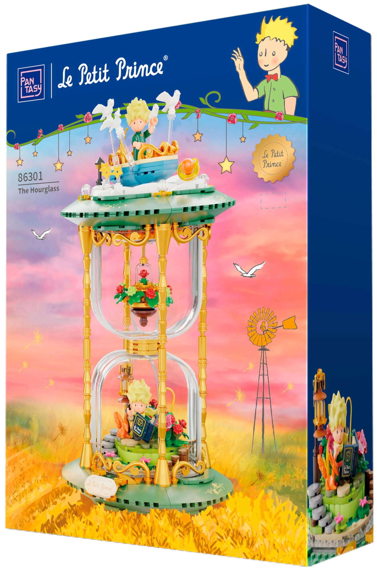 Dette udstillingsvenlige byggesæt i form af et stilfuldt timeglas forener poesien fra det tidløse værk med moderne design. Grønne sokler, gyldne søjler og gennemsigtige kamre med mini-scener skaber et effektfuldt diorama – Den Lille Prins, ræven, rosen under glaskuppel og stjernehimlen. Takket være præcis pasform og trykte mønstre bevarer modellen et rent udseende i mange år.