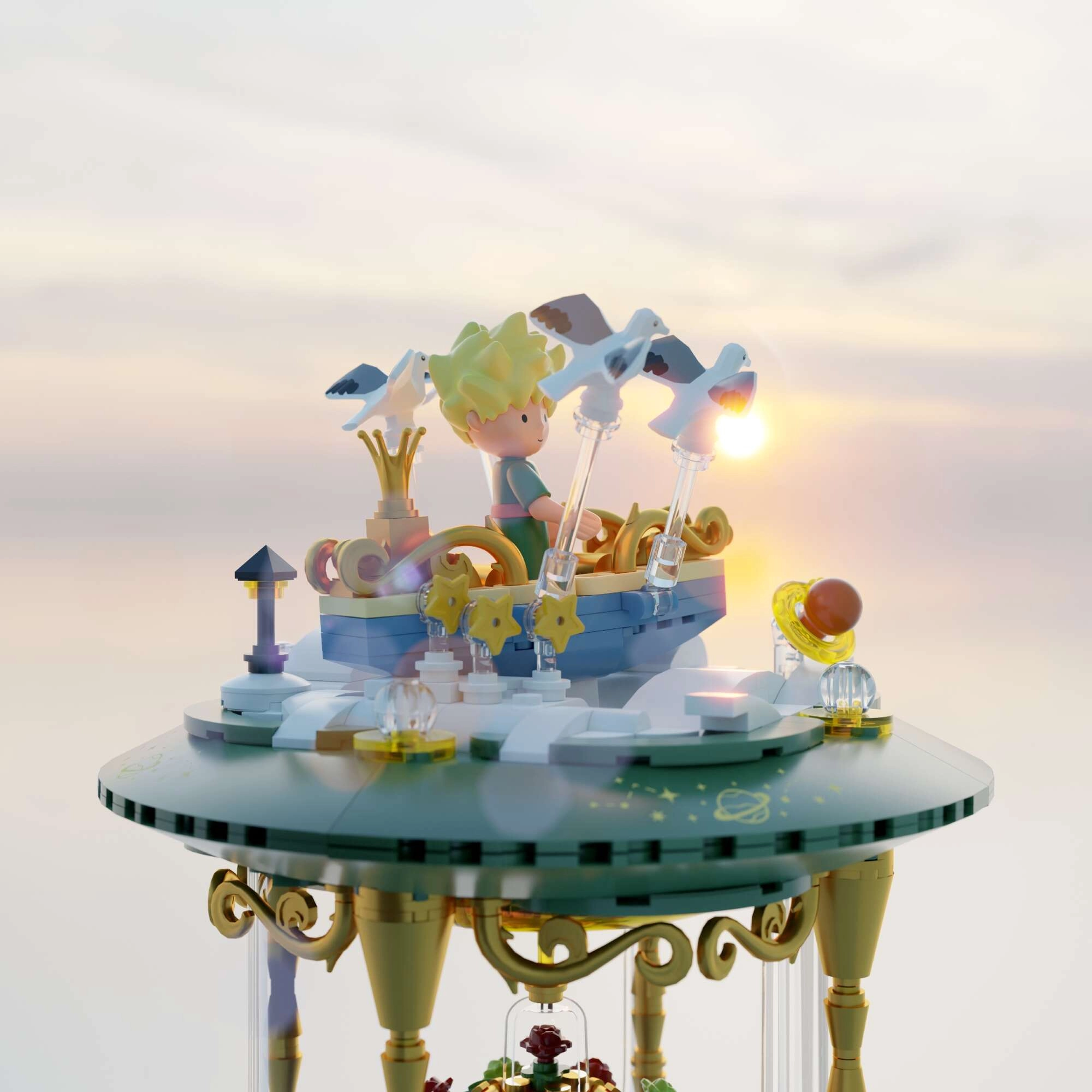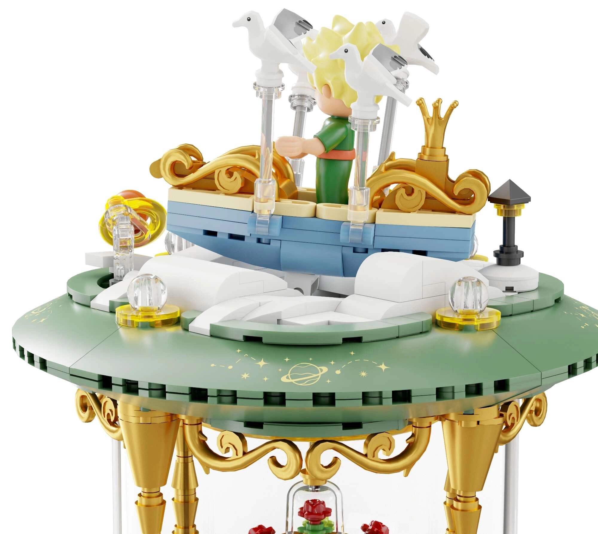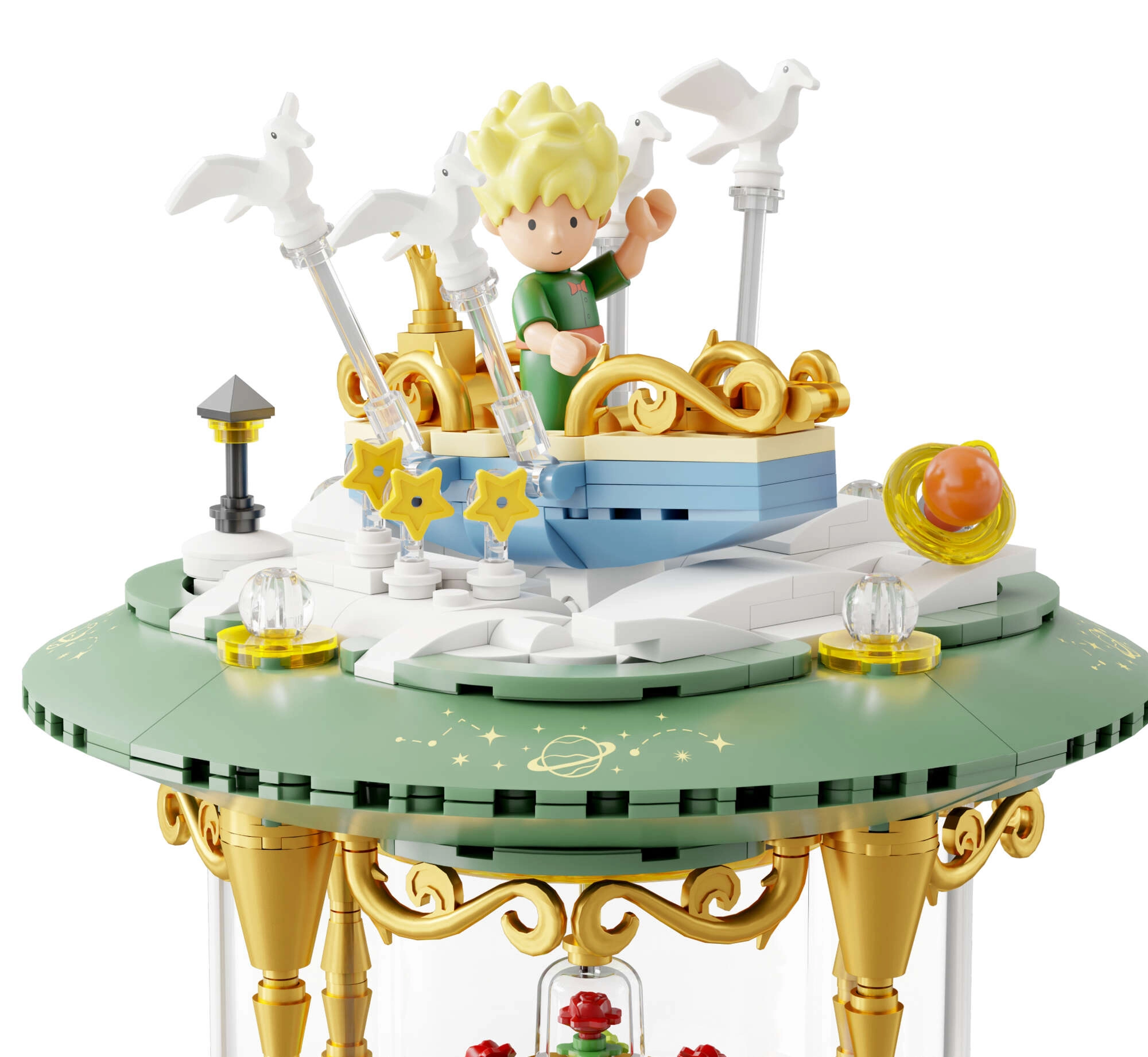 Mini-scener med prinsen, ræven, rosen og stjerner skaber en poetisk fortælling i flere niveauer. Transparente dele og gyldne ornamenter understreger modellens udstillingskarakter.