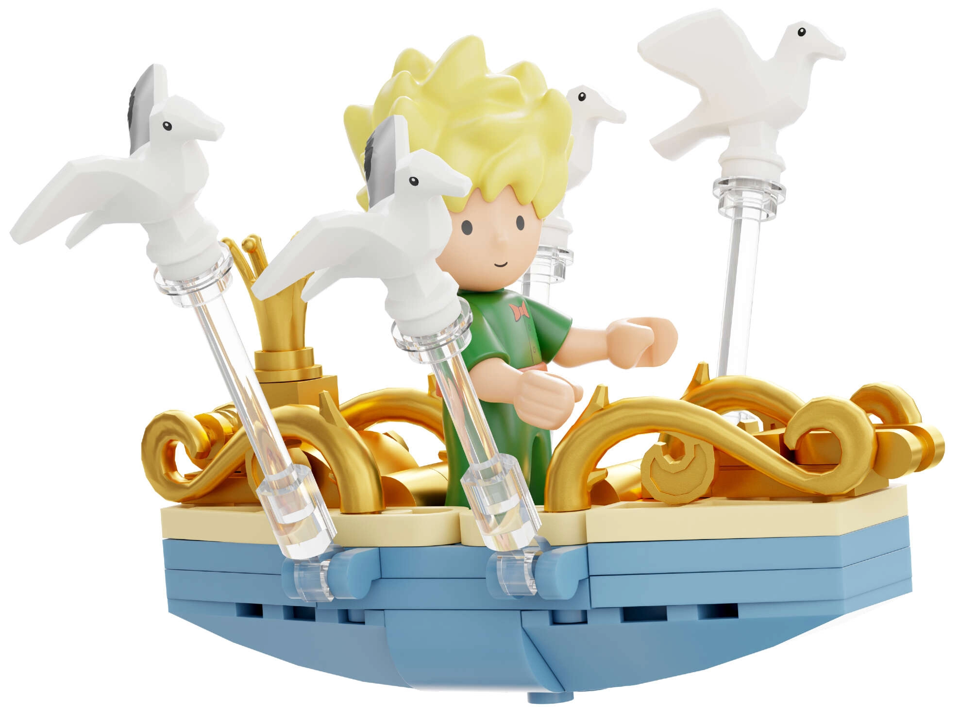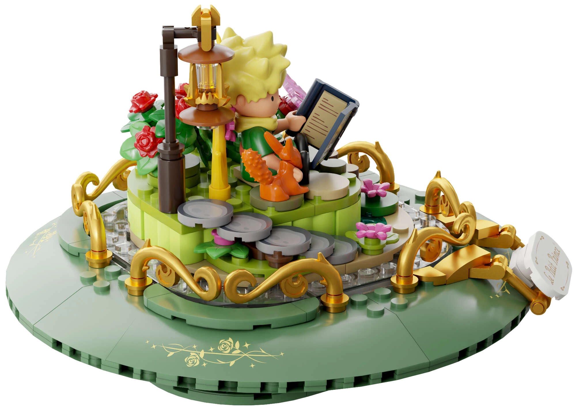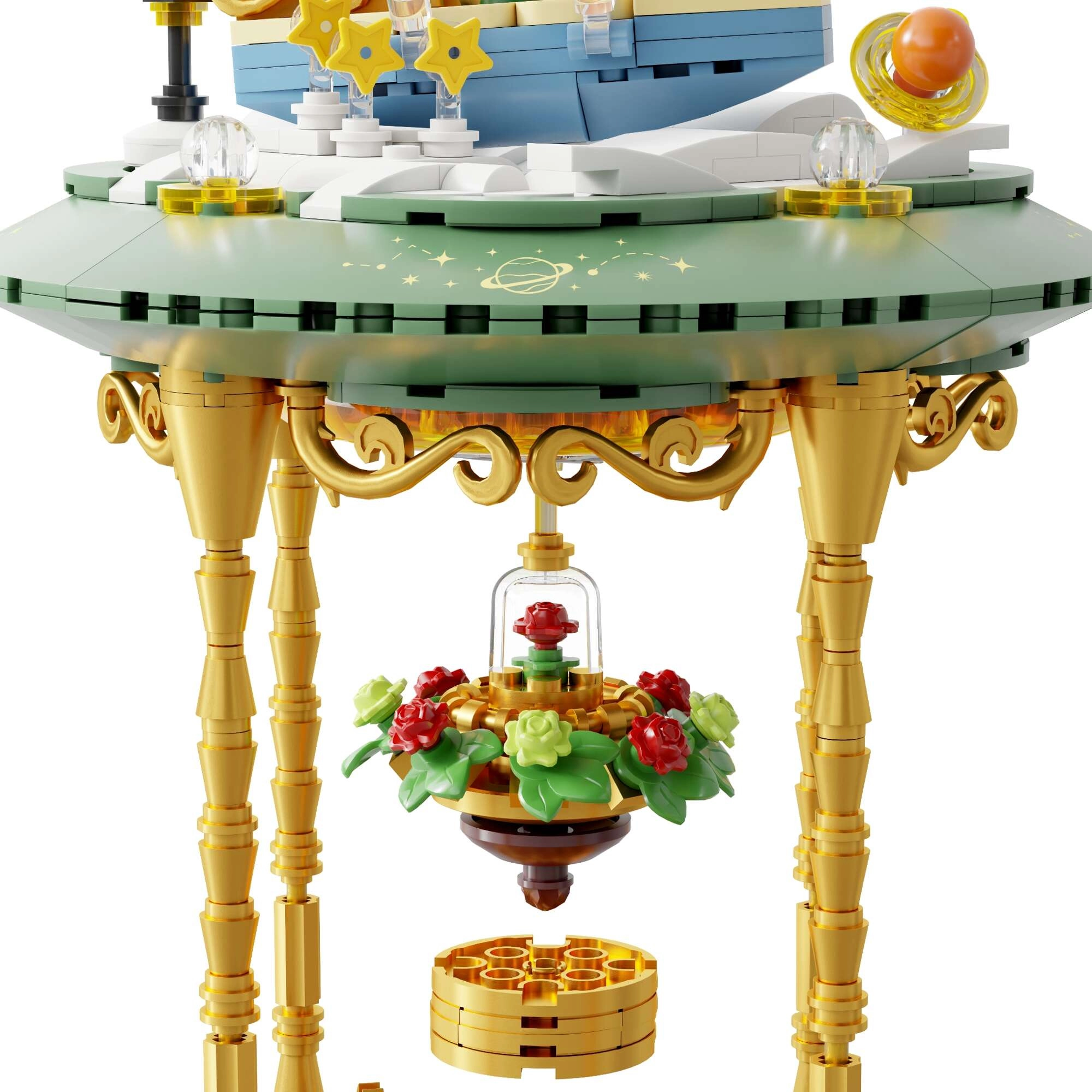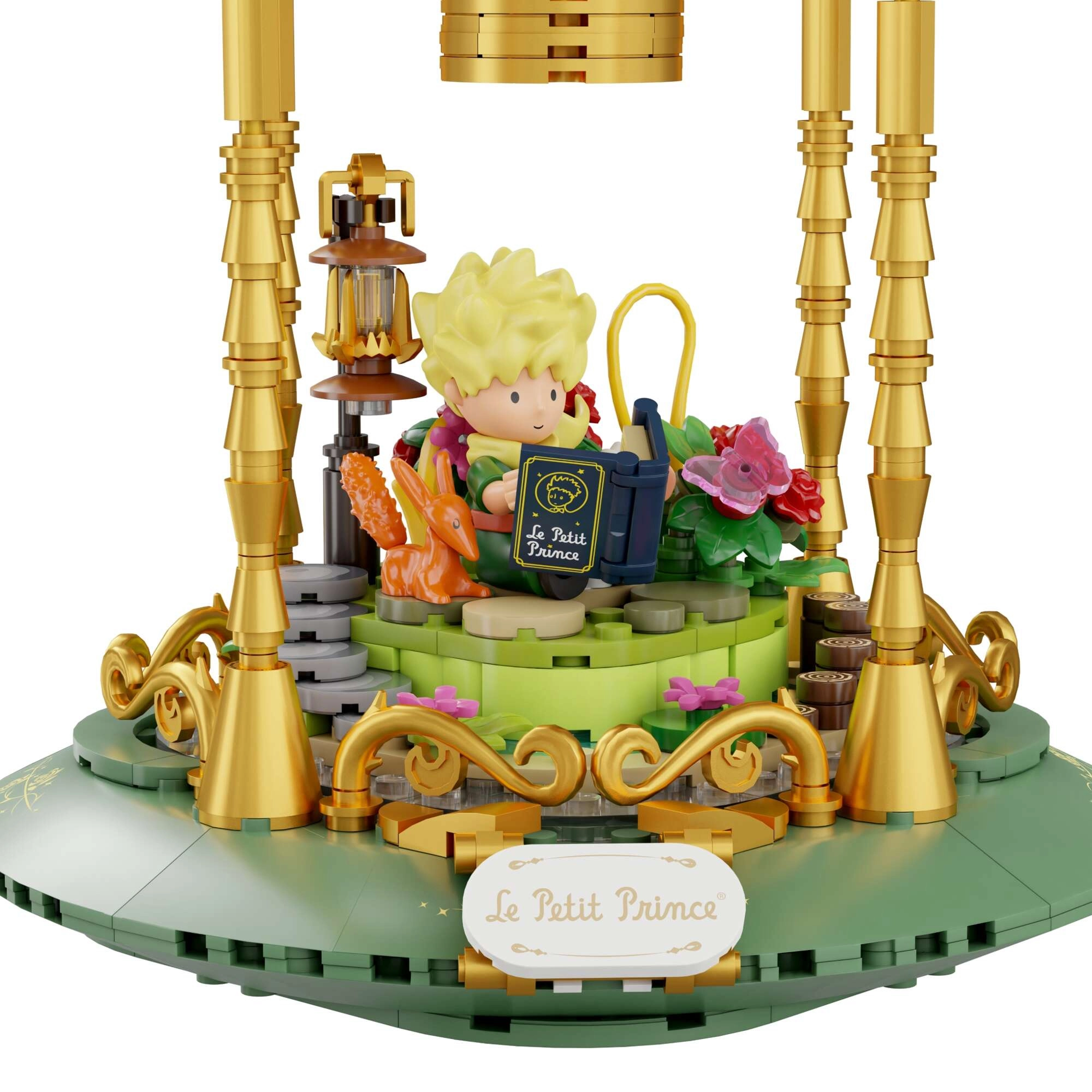 Mini-scener med prinsen, ræven, rosen og stjerner skaber en poetisk fortælling i flere niveauer. Transparente dele og gyldne ornamenter understreger modellens udstillingskarakter.