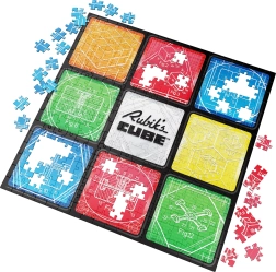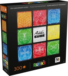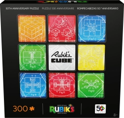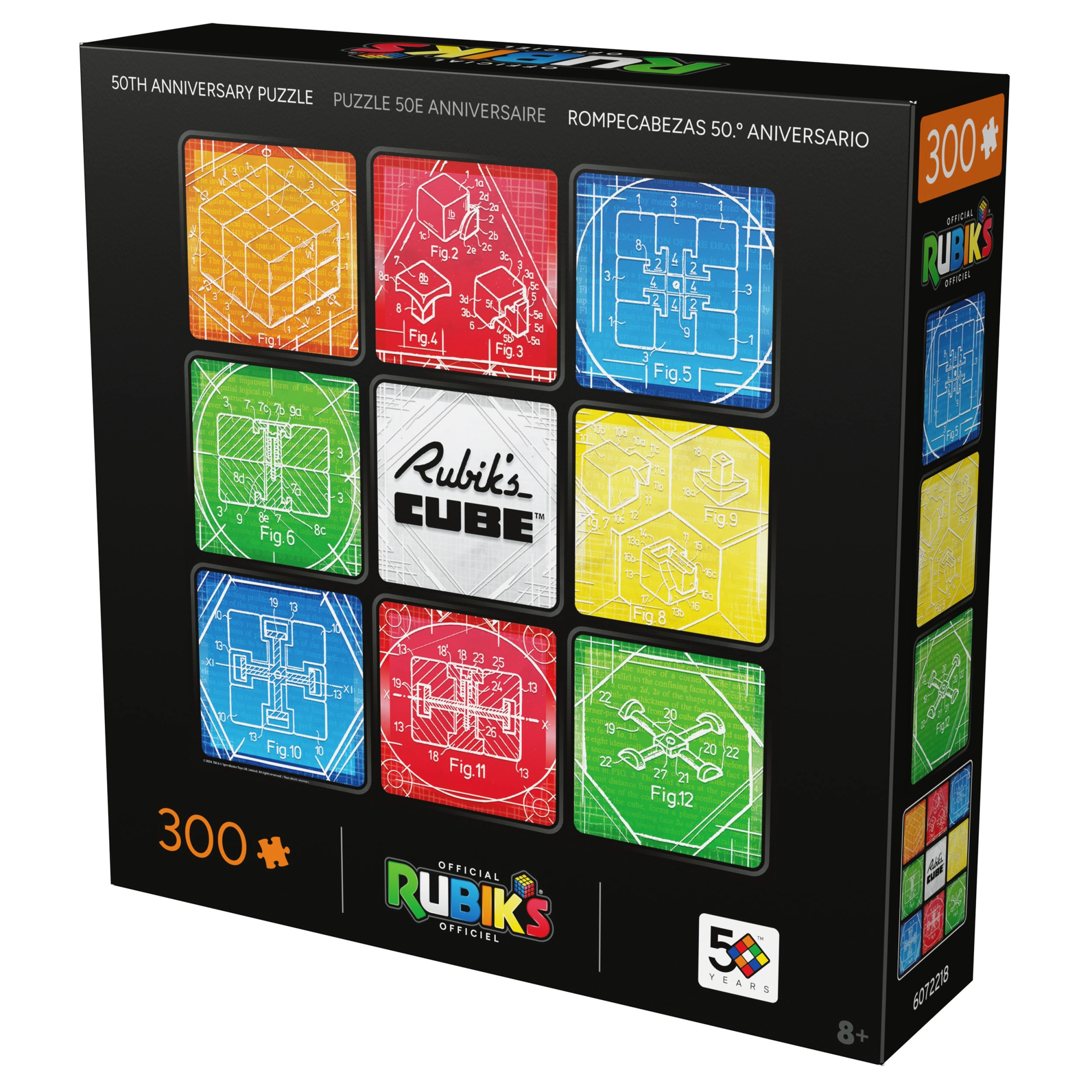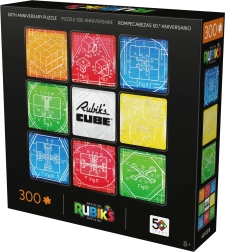 Indhold og motiv: Når puslespillet er samlet, får du et kvadratisk billede på 50,8 × 50,8 cm med ni felter, der refererer til den klassiske 3×3-opsætning. Midten af kompositionen prydes af RUBIK’S CUBE-logoet, omgivet af tekniske tegninger af den berømte ternings mekanik.