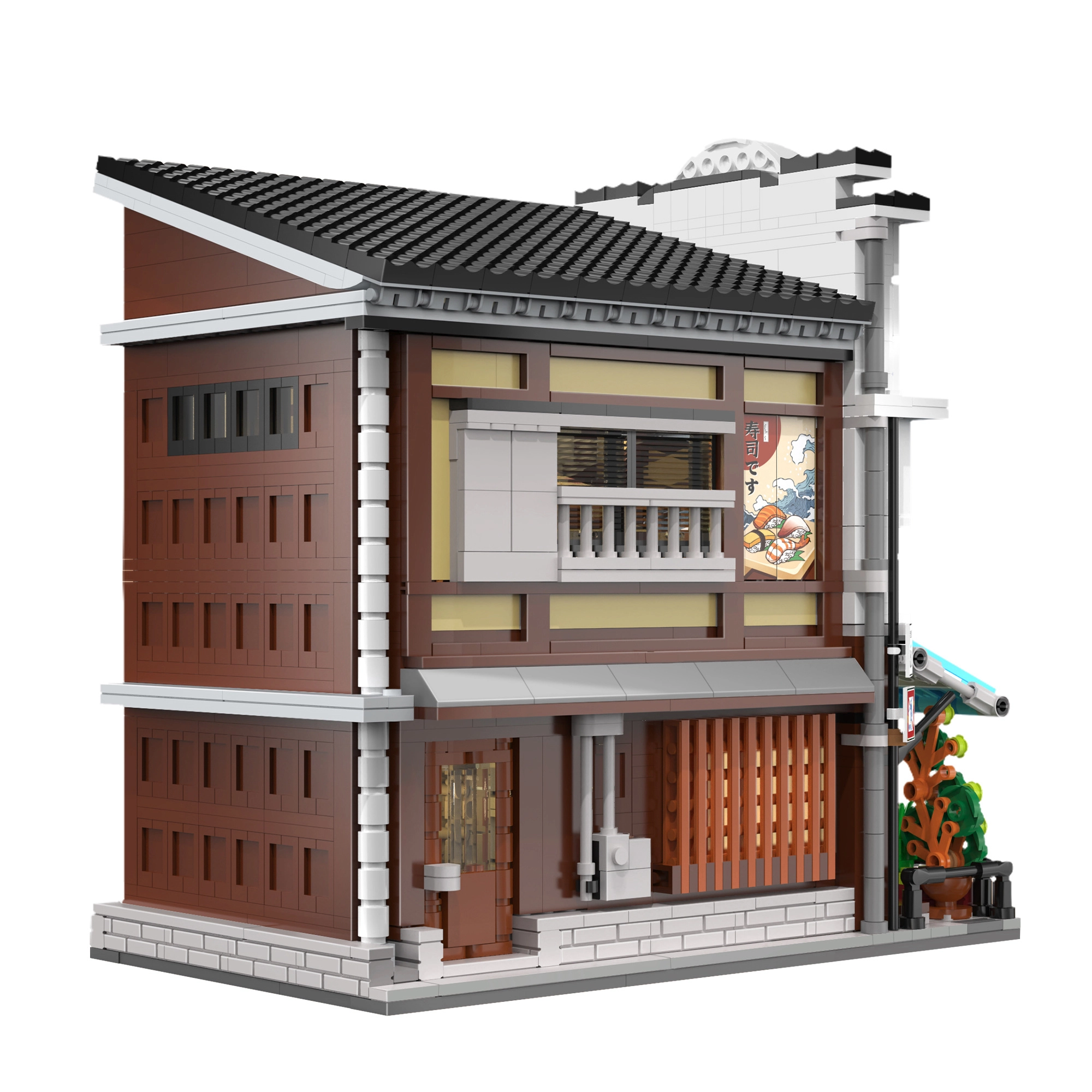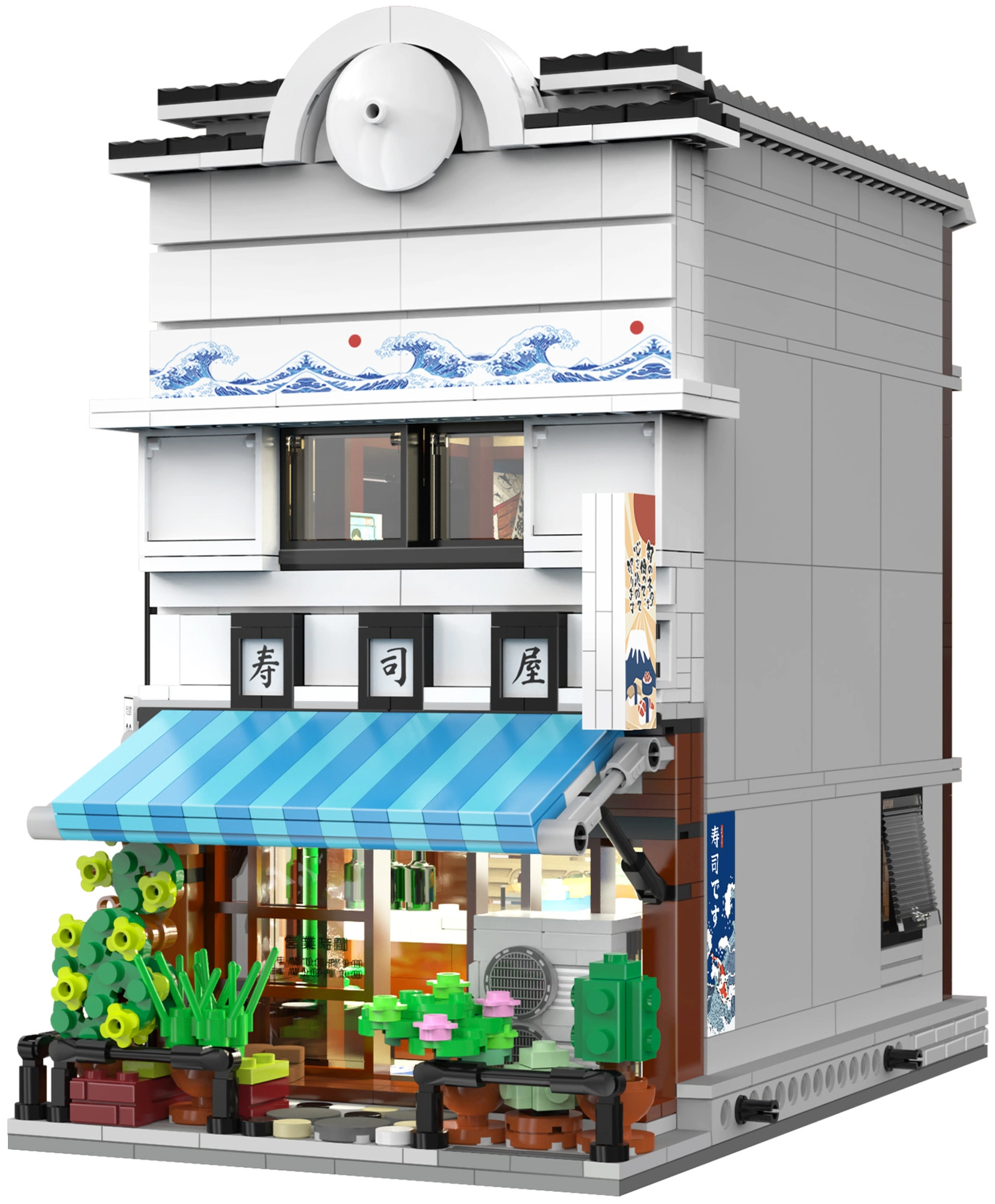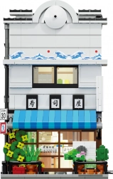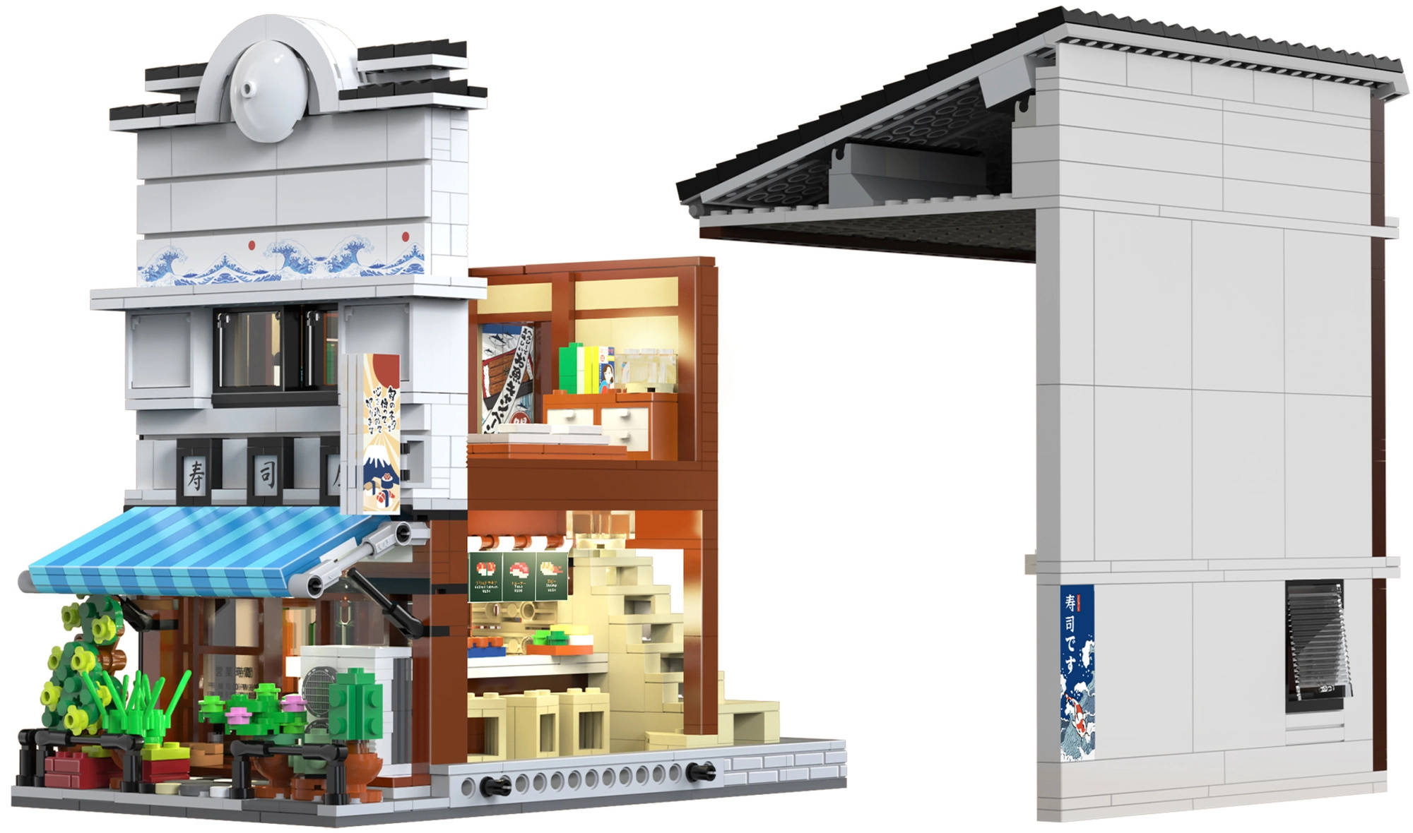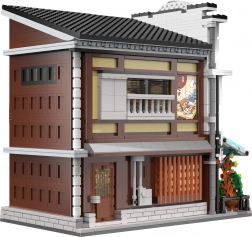 Dette designbyggesæt bringer en autentisk japansk to-etagers sushibutik med fokus på detaljer i både interiør og eksteriør. Den åbningsbare konstruktion gør det nemt at kigge ind – her finder du barstole, dekorativ bambus, trappe samt et hyggeligt værelse på første sal med seng, TV og kommode.