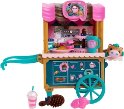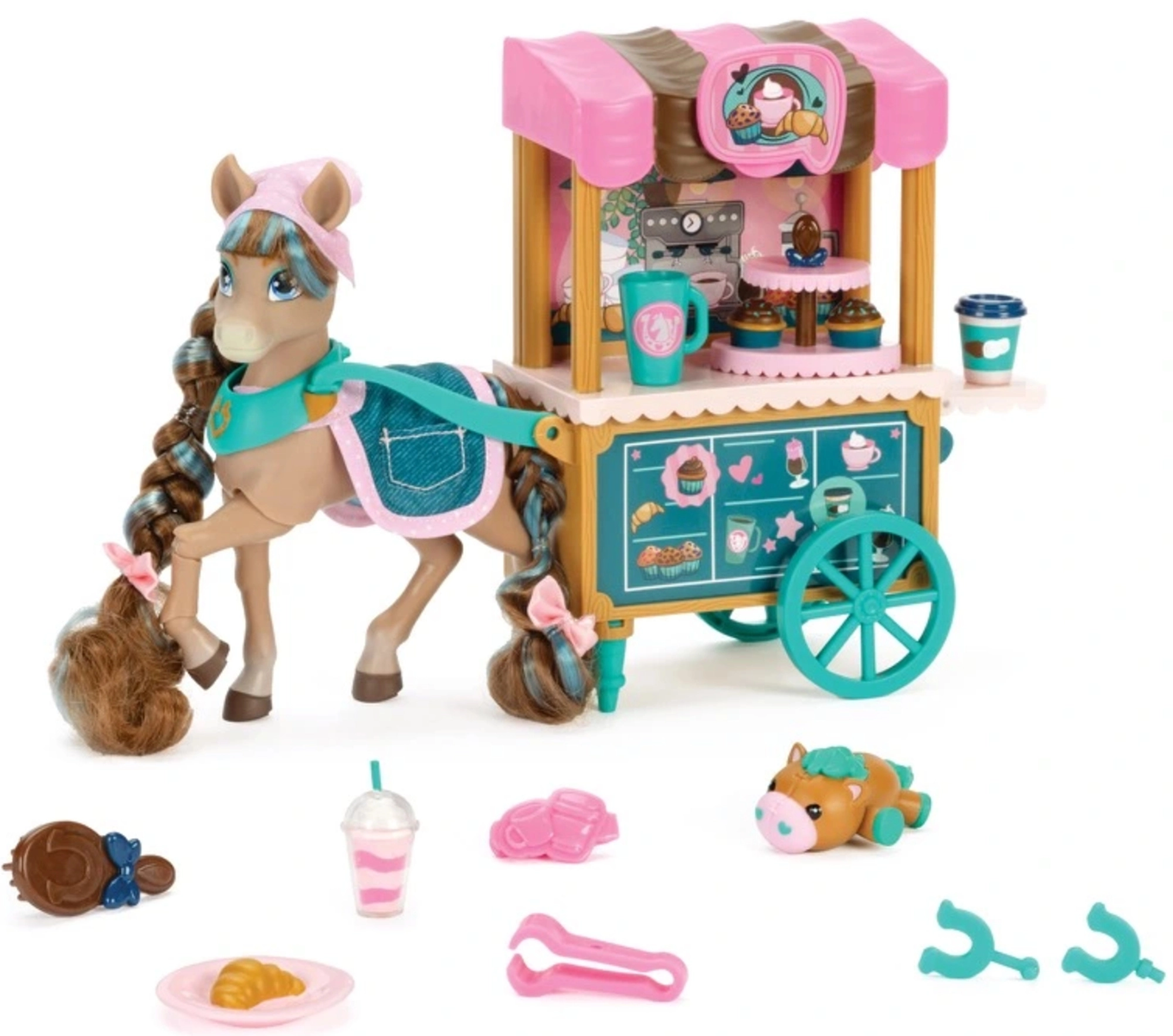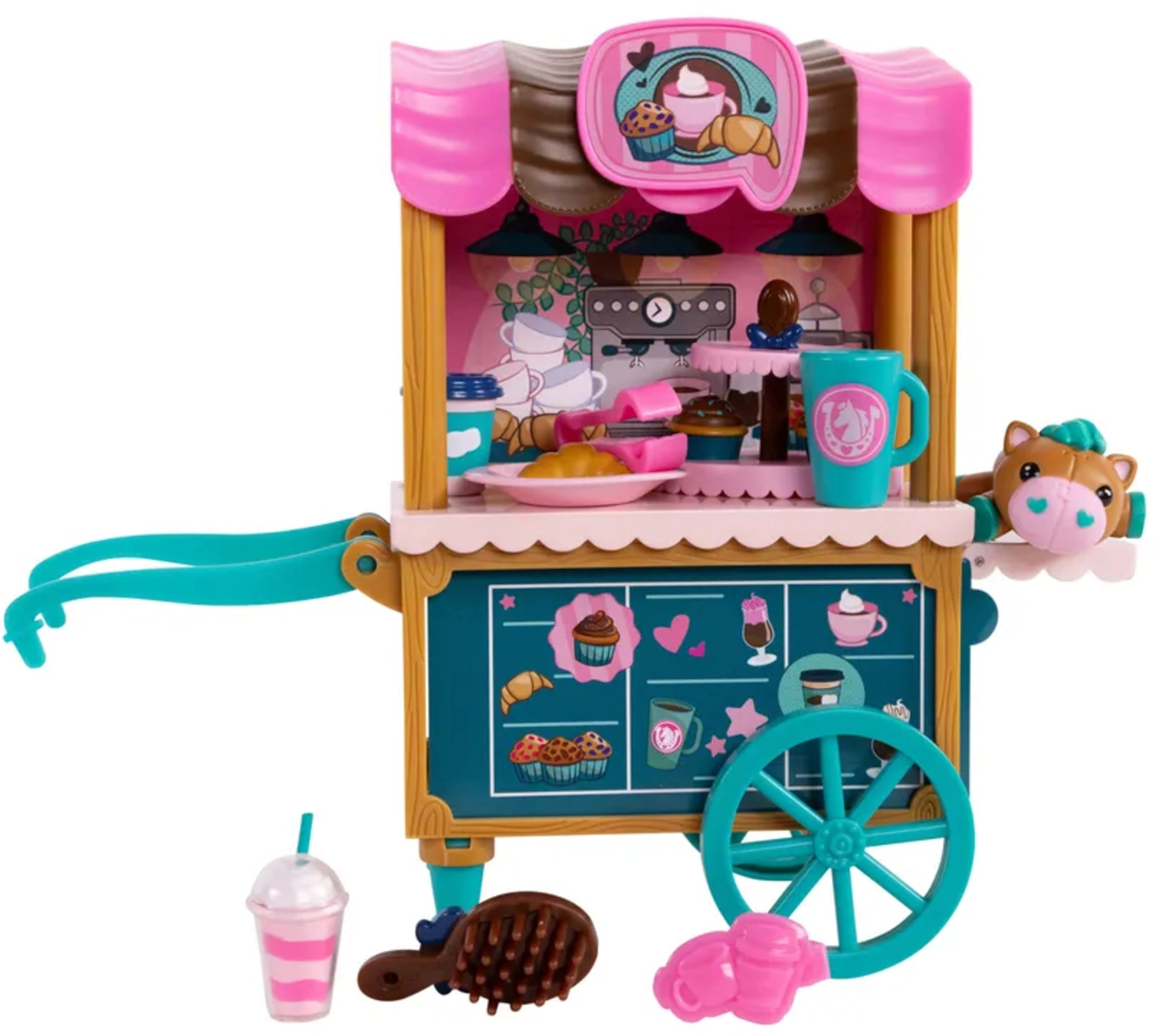 Vognen har roterende hjul, håndtag og hylder til lækkerier, farverigt tag og cafégrafik. Sættet inkluderer også serverings- og bageudstyr, et lille kæledyr og en børste til at ordne manken. Alt er designet til kreativ rolleleg, finmotorisk udvikling og social leg.