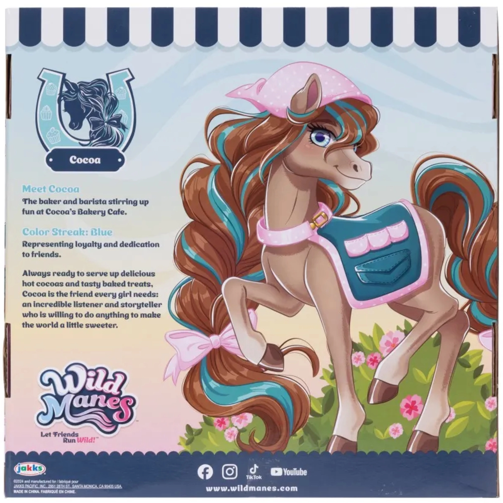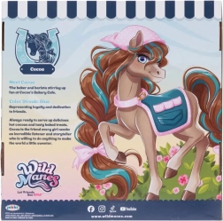 Ponyen Cocoa fra den populære serie WILD MANES kommer med en detaljeret Bakery Café-vogn, hvor der kan serveres drikkevarer og kager. Figuren har en detaljeret manke med fletninger, markante øjne og bærer et stilfuldt forklæde – klar til ethvert eventyr. Takket være hesteskoformede clips kan Cocoa holde tilbehør og nemt spille forskellige scener.