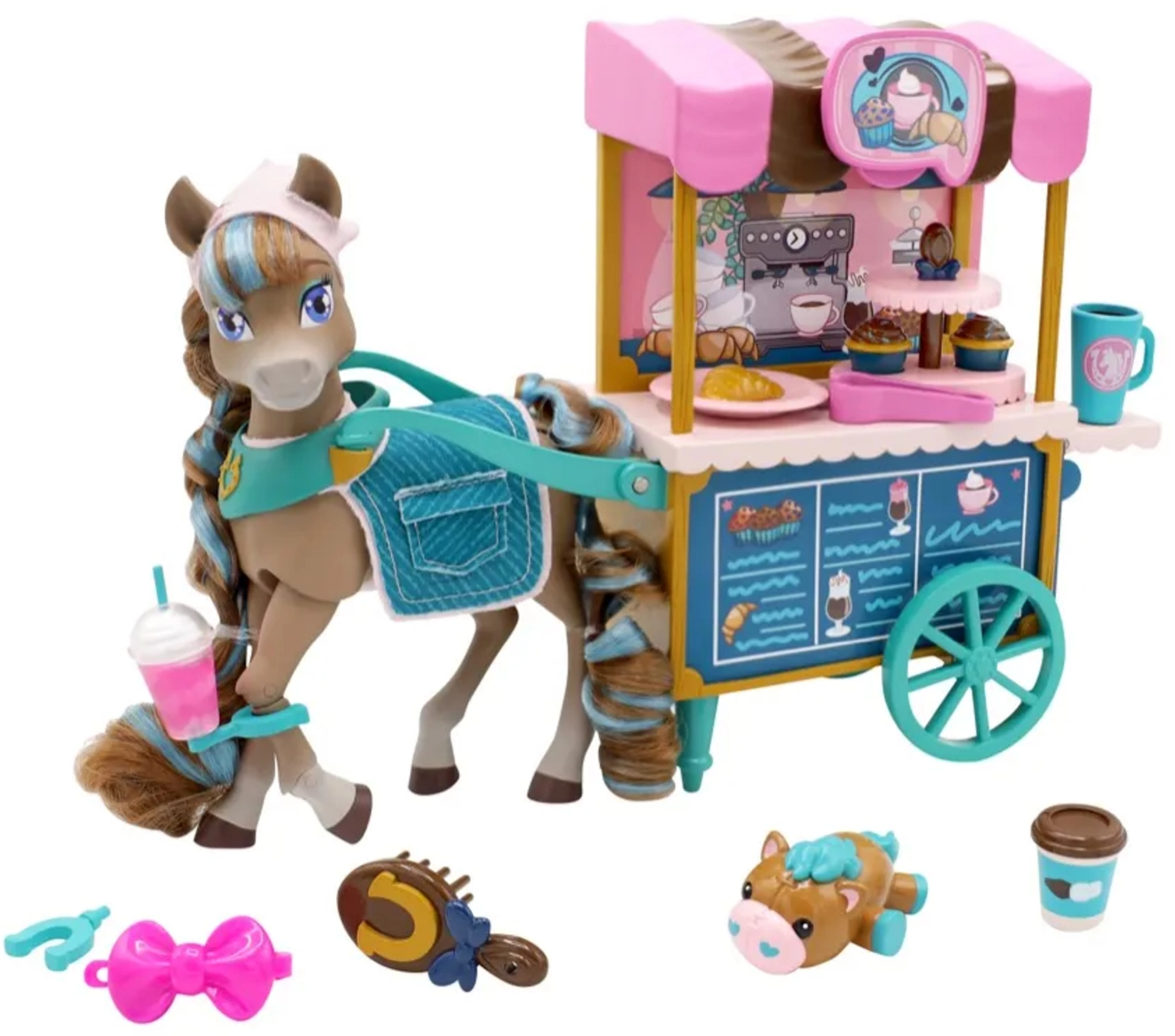 Oplev det magiske Wild Manes-sæt med ponyfiguren Cocoa og en stilfuld cafévogn. Børn vil elske fantasifuld leg, servering af lækre sager og pleje af ponyen takket være det rige tilbehør. Figuren har bevægelige lemmer, vognen har funktionelle hjul og tøjler, og der medfølger sødt tilbehør som cupcakes, drikkevarer og en børste.