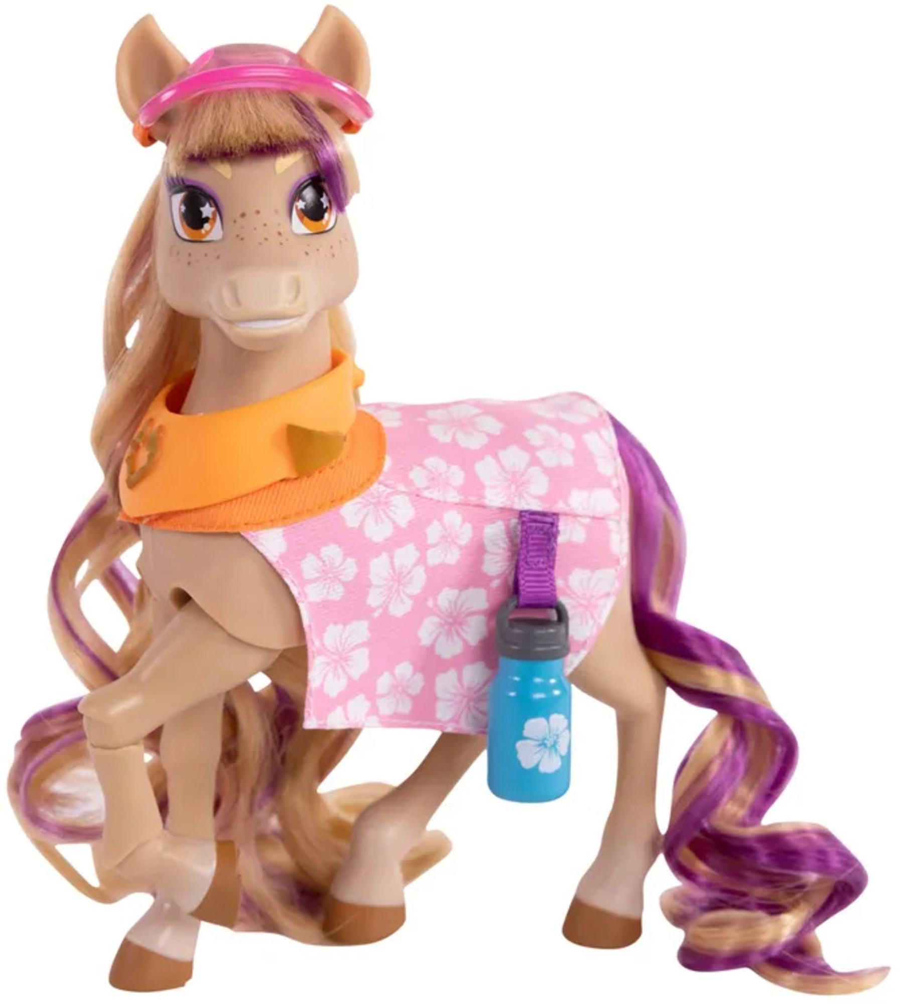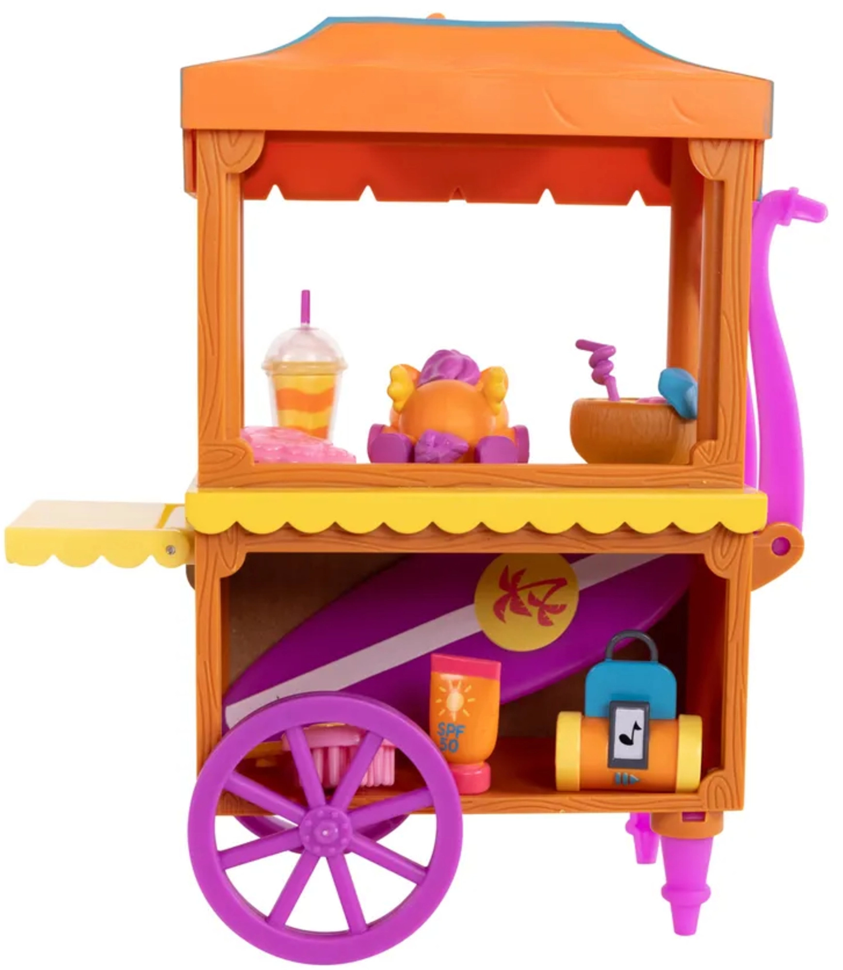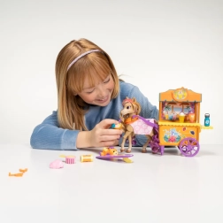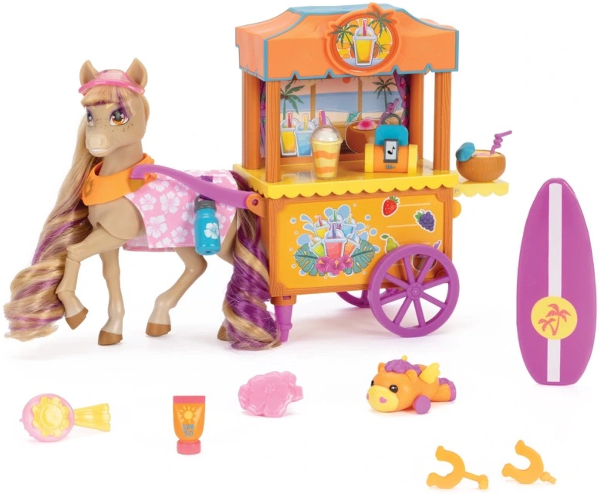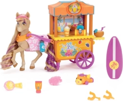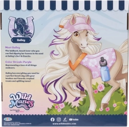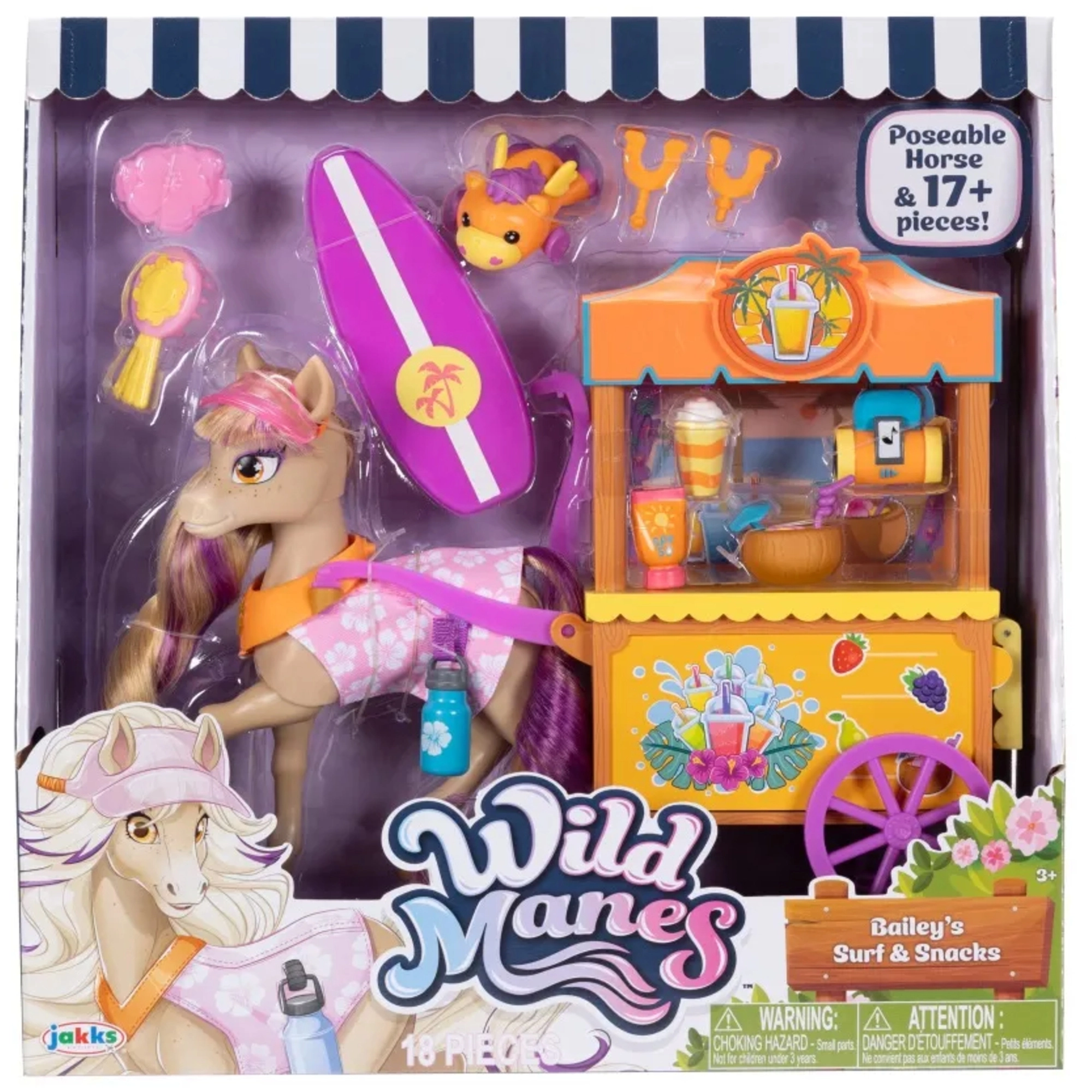 Figuren Bailey skiller sig ud med en lang manke med lilla striber, søde fregner og en stilfuld gennemsigtig skyggekasket. Takket være bevægelige lemmer kan du nemt sætte hende i forskellige positurer og genskabe favoritscener fra WILD MANES. Sættet omfatter den store vogn Surf & Snacks med hjul og tøjler, som kan klikkes på hesten, så salgsboden virkelig kan “køres i gang”.