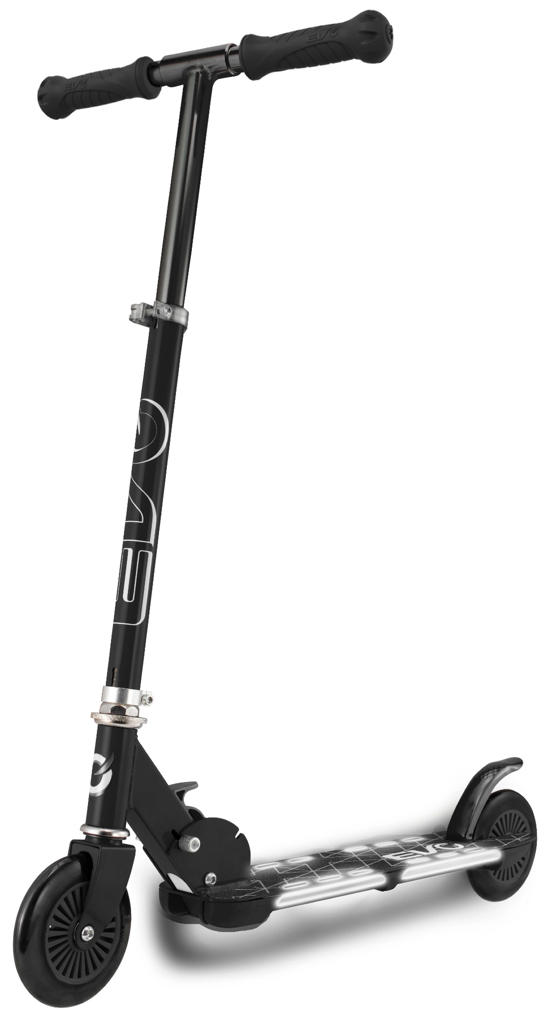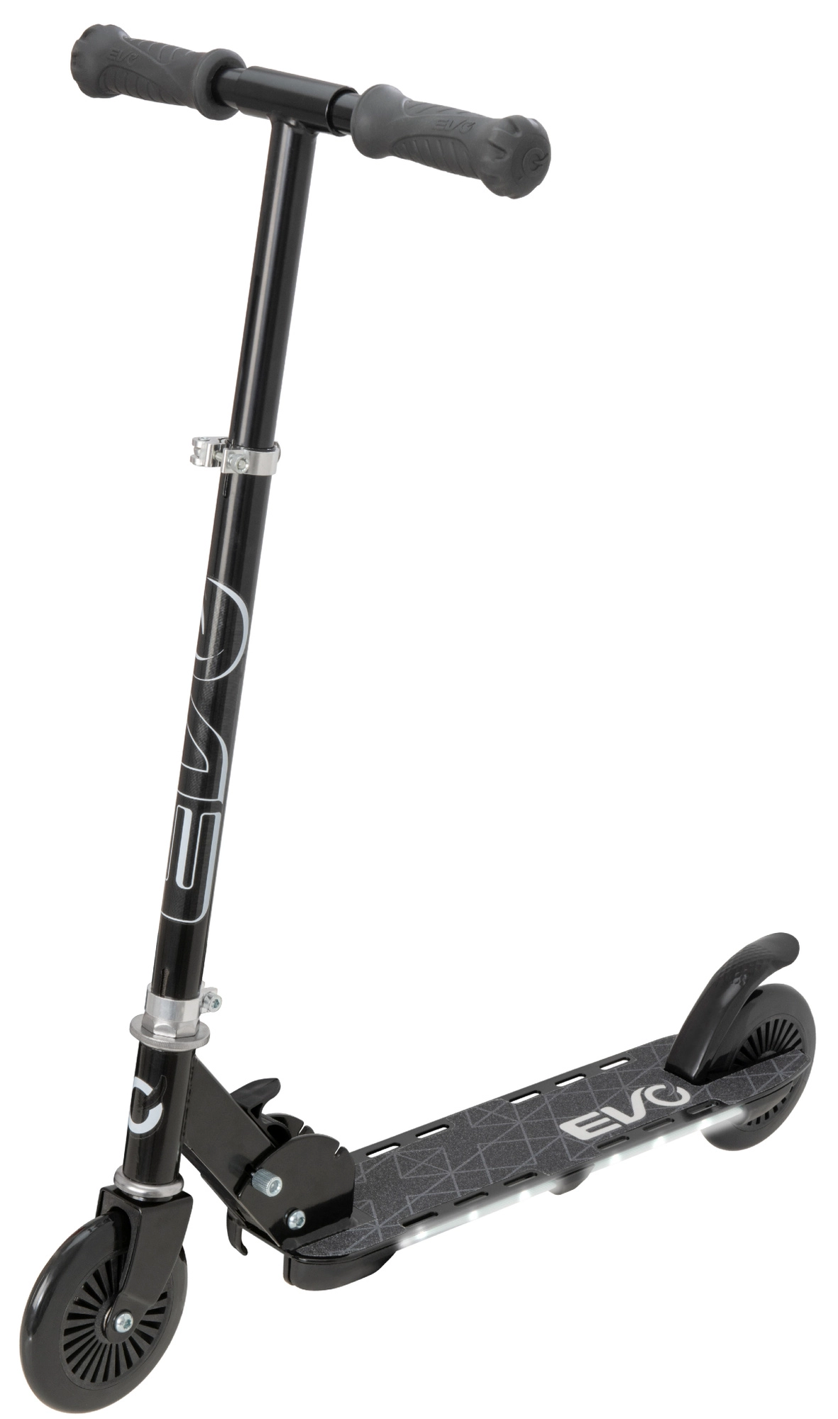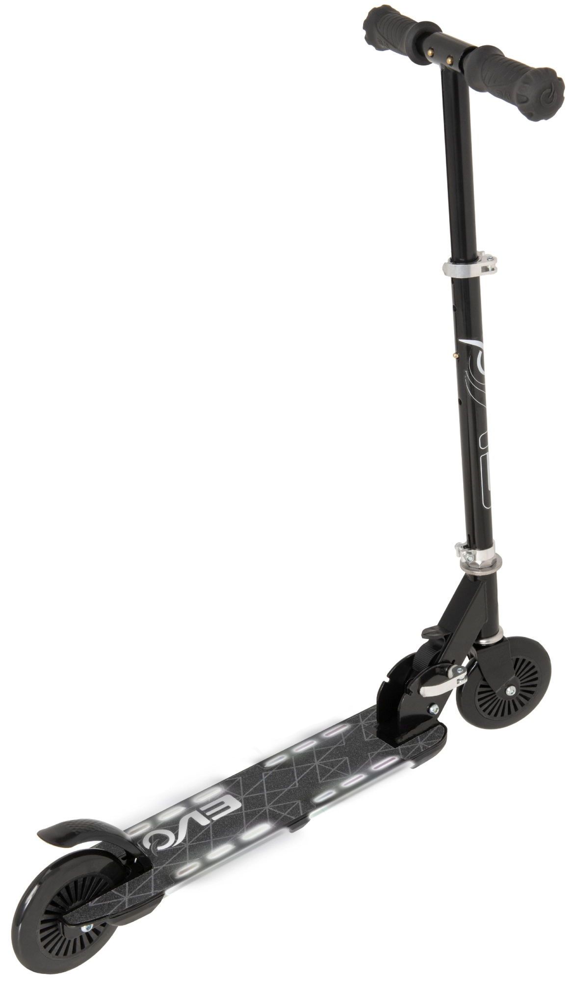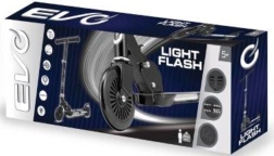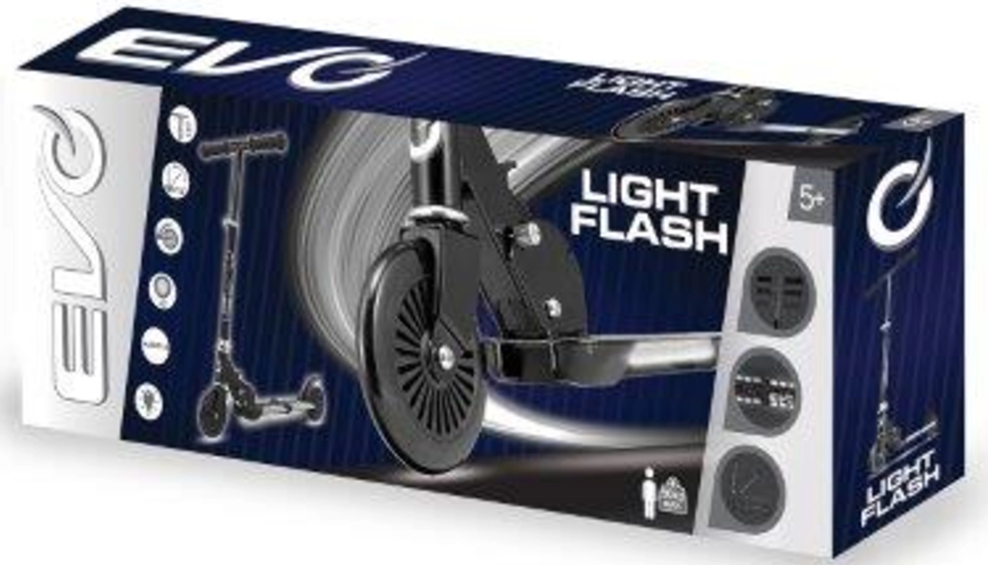 Børneløbehjulet EVO Light Flash er let, sammenklappeligt og har justerbart styr til børn fra 5 år. Det tilbyder støjsvage gummihjul med ABEC-5 lejer, fodbremse på bagskærmen og et sjovt lysende trinbræt med 4× AAA-batterier. Ideelt til rekreativ kørsel på jævne overflader med fokus på stabilitet og sikkerhed.