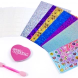 - 6 neglemønstre, 5 klæbende skabeloner, ark med klistermærker, spatel, hjerteformet fil, vejledning