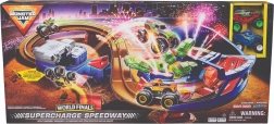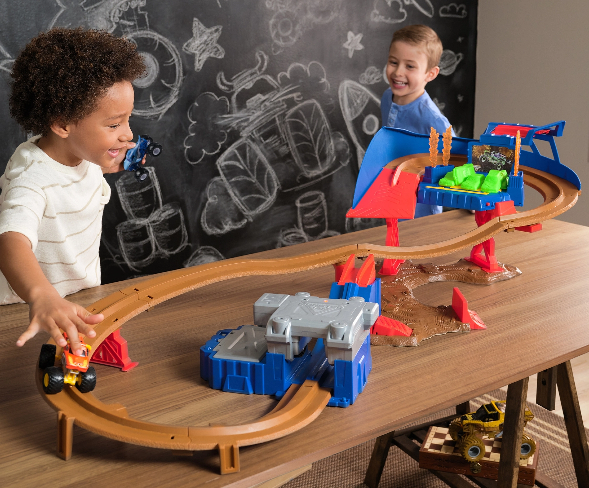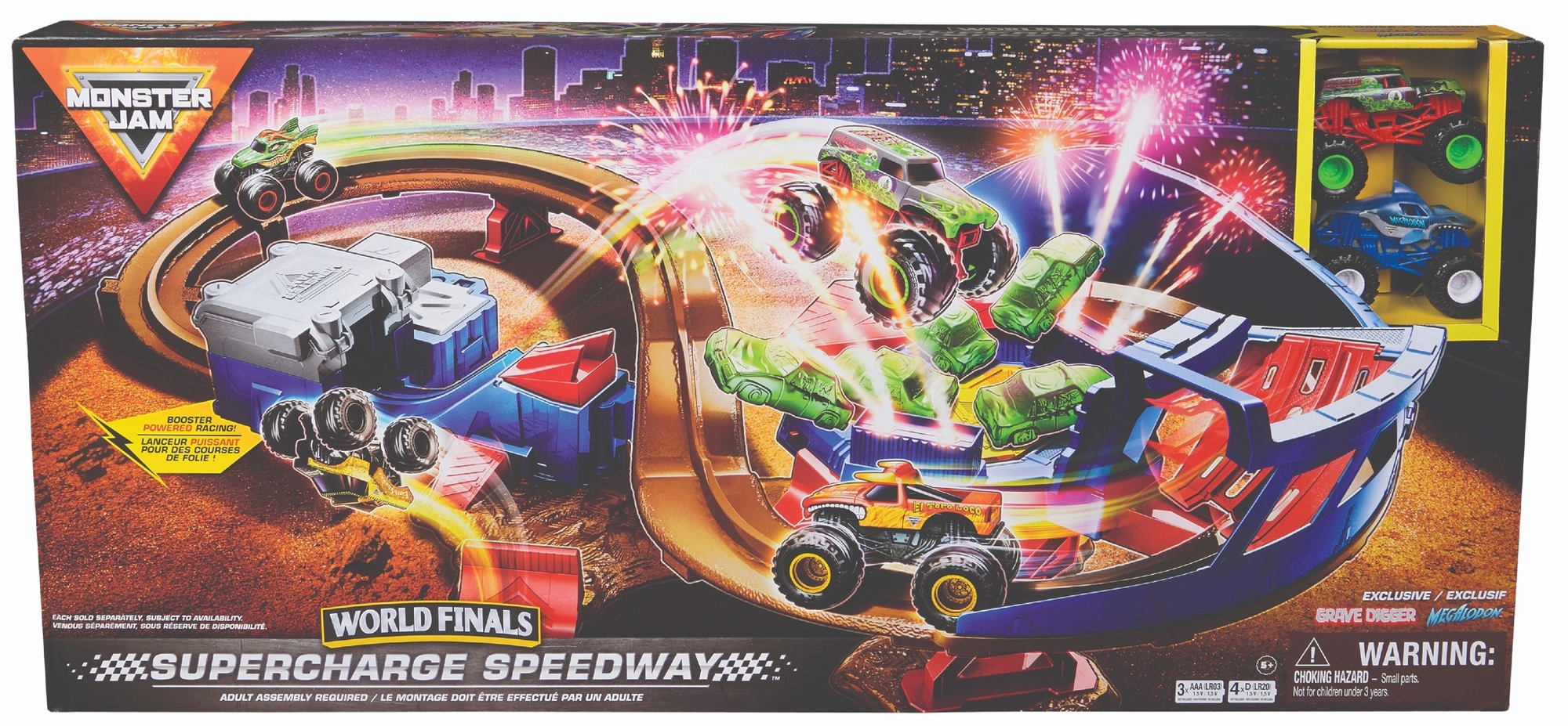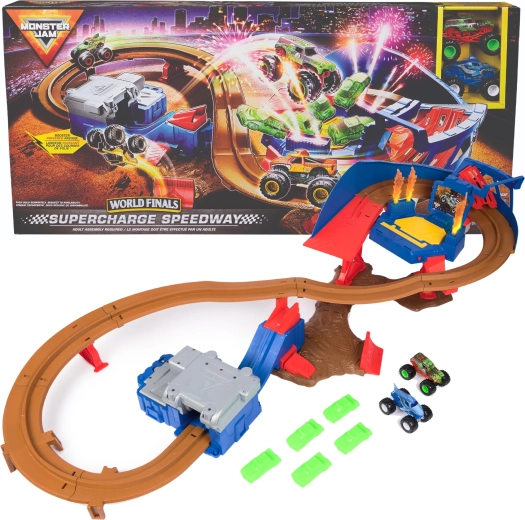 MONSTER JAM Supercharge Speedway forvandler bordet eller gulvet til en arena fuld af adrenalin. Den manuelle affyrer sender truckene ud i høj fart, mens hævede sektioner, broer og sving leder direkte ind i den oplyste crash-zone for spektakulære sammenstød og landinger. Når runden er kørt, vender køretøjerne tilbage til start – så sjoven fortsætter uden pauser.